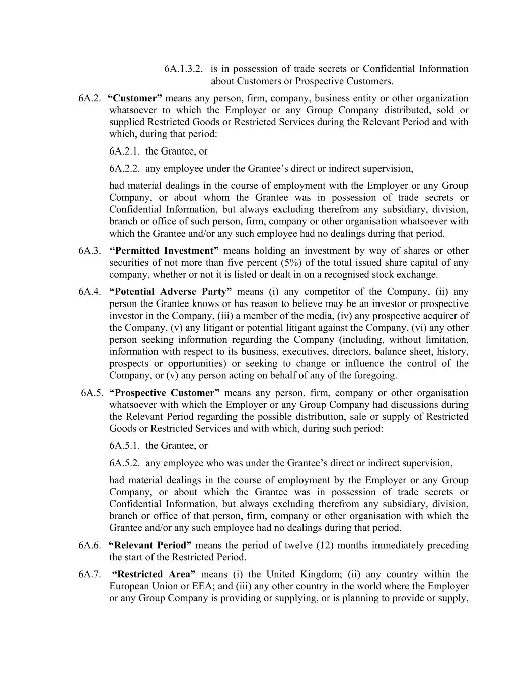 6A.1.3.2. is in possession of trade secrets or Confidential Information about Customers or Prospective Customers. 6A.2. “Customer” means any person, firm, company, business entity or other organization whatsoever to which the Employer or any Group Company distributed, sold or supplied Restricted Goods or Restricted Services during the Relevant Period and with which, during that period: 6A.2.1. the Grantee, or 6A.2.2. any employee under the Grantee’s direct or indirect supervision, had material dealings in the course of employment with the Employer or any Group Company, or about whom the Grantee was in possession of trade secrets or Confidential Information, but always excluding therefrom any subsidiary, division, branch or office of such person, firm, company or other organisation whatsoever with which the Grantee and/or any such employee had no dealings during that period. 6A.3. “Permitted Investment” means holding an investment by way of shares or other securities of not more than five percent (5%) of the total issued share capital of any company, whether or not it is listed or dealt in on a recognised stock exchange. 6A.4. “Potential Adverse Party” means (i) any competitor of the Company, (ii) any person the Grantee knows or has reason to believe may be an investor or prospective investor in the Company, (iii) a member of the media, (iv) any prospective acquirer of the Company, (v) any litigant or potential litigant against the Company, (vi) any other person seeking information regarding the Company (including, without limitation, information with respect to its business, executives, directors, balance sheet, history, prospects or opportunities) or seeking to change or influence the control of the Company, or (v) any person acting on behalf of any of the foregoing. 6A.5. “Prospective Customer” means any person, firm, company or other organisation whatsoever with which the Employer or any Group Company had discussions during the Relevant Period regarding the possible distribution, sale or supply of Restricted Goods or Restricted Services and with which, during such period: 6A.5.1. the Grantee, or 6A.5.2. any employee who was under the Grantee’s direct or indirect supervision, had material dealings in the course of employment by the Employer or any Group Company, or about which the Grantee was in possession of trade secrets or Confidential Information, but always excluding therefrom any subsidiary, division, branch or office of that person, firm, company or other organisation with which the Grantee and/or any such employee had no dealings during that period. 6A.6. “Relevant Period” means the period of twelve (12) months immediately preceding the start of the Restricted Period. 6A.7. “Restricted Area” means (i) the United Kingdom; (ii) any country within the European Union or EEA; and (iii) any other country in the world where the Employer or any Group Company is providing or supplying, or is planning to provide or supply,
