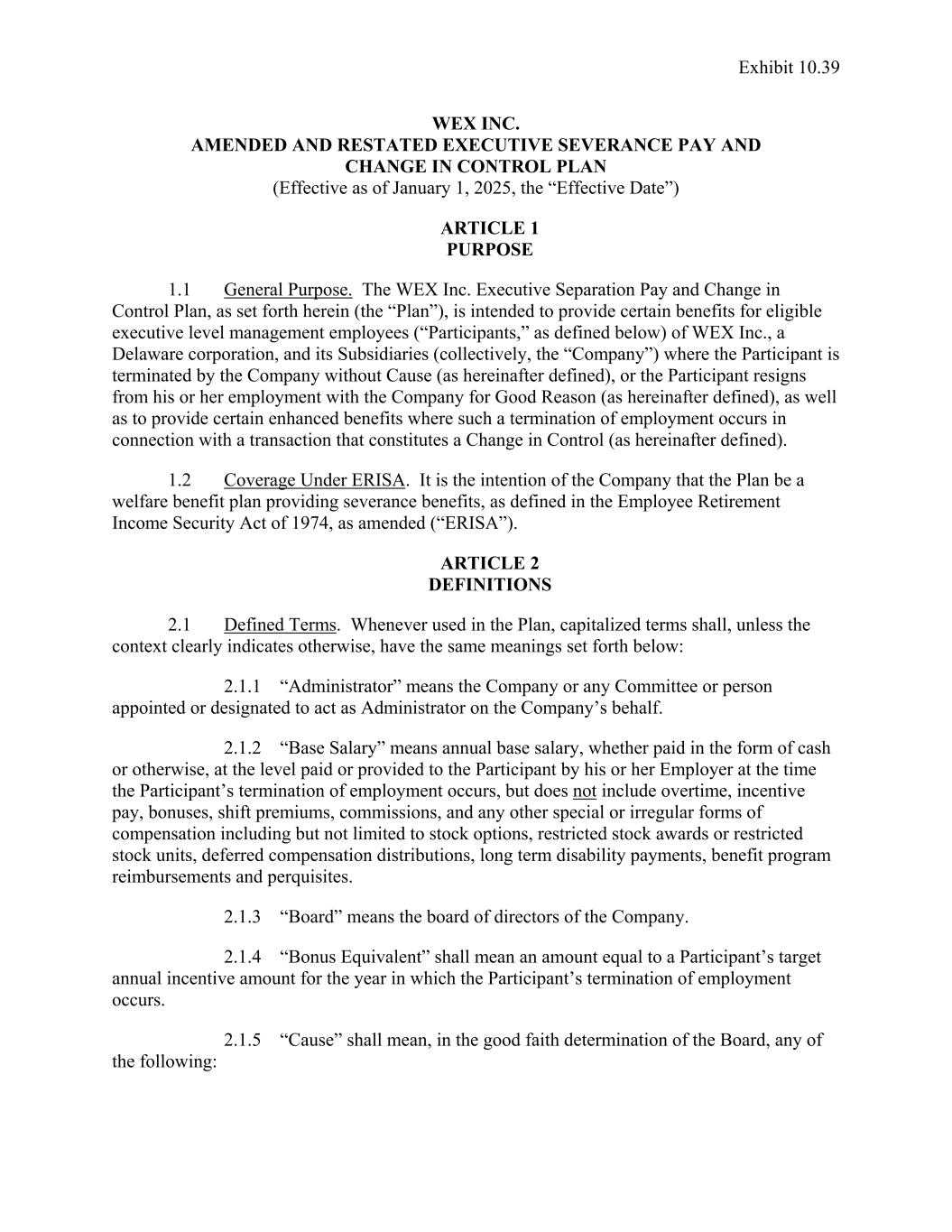 Exhibit 10.39 WEX INC. AMENDED AND RESTATED EXECUTIVE SEVERANCE PAY AND CHANGE IN CONTROL PLAN (Effective as of January 1, 2025, the “Effective Date”) ARTICLE 1 PURPOSE 1.1 General Purpose. The WEX Inc. Executive Separation Pay and Change in Control Plan, as set forth herein (the “Plan”), is intended to provide certain benefits for eligible executive level management employees (“Participants,” as defined below) of WEX Inc., a Delaware corporation, and its Subsidiaries (collectively, the “Company”) where the Participant is terminated by the Company without Cause (as hereinafter defined), or the Participant resigns from his or her employment with the Company for Good Reason (as hereinafter defined), as well as to provide certain enhanced benefits where such a termination of employment occurs in connection with a transaction that constitutes a Change in Control (as hereinafter defined). 1.2 Coverage Under ERISA. It is the intention of the Company that the Plan be a welfare benefit plan providing severance benefits, as defined in the Employee Retirement Income Security Act of 1974, as amended (“ERISA”). ARTICLE 2 DEFINITIONS 2.1 Defined Terms. Whenever used in the Plan, capitalized terms shall, unless the context clearly indicates otherwise, have the same meanings set forth below: 2.1.1 “Administrator” means the Company or any Committee or person appointed or designated to act as Administrator on the Company’s behalf. 2.1.2 “Base Salary” means annual base salary, whether paid in the form of cash or otherwise, at the level paid or provided to the Participant by his or her Employer at the time the Participant’s termination of employment occurs, but does not include overtime, incentive pay, bonuses, shift premiums, commissions, and any other special or irregular forms of compensation including but not limited to stock options, restricted stock awards or restricted stock units, deferred compensation distributions, long term disability payments, benefit program reimbursements and perquisites. 2.1.3 “Board” means the board of directors of the Company. 2.1.4 “Bonus Equivalent” shall mean an amount equal to a Participant’s target annual incentive amount for the year in which the Participant’s termination of employment occurs. 2.1.5 “Cause” shall mean, in the good faith determination of the Board, any of the following: