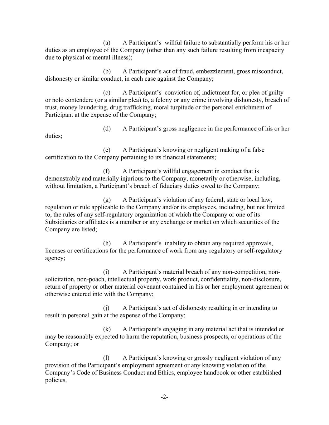 -2- (a) A Participant’s willful failure to substantially perform his or her duties as an employee of the Company (other than any such failure resulting from incapacity due to physical or mental illness); (b) A Participant’s act of fraud, embezzlement, gross misconduct, dishonesty or similar conduct, in each case against the Company; (c) A Participant’s conviction of, indictment for, or plea of guilty or nolo contendere (or a similar plea) to, a felony or any crime involving dishonesty, breach of trust, money laundering, drug trafficking, moral turpitude or the personal enrichment of Participant at the expense of the Company; (d) A Participant’s gross negligence in the performance of his or her duties; (e) A Participant’s knowing or negligent making of a false certification to the Company pertaining to its financial statements; (f) A Participant’s willful engagement in conduct that is demonstrably and materially injurious to the Company, monetarily or otherwise, including, without limitation, a Participant’s breach of fiduciary duties owed to the Company; (g) A Participant’s violation of any federal, state or local law, regulation or rule applicable to the Company and/or its employees, including, but not limited to, the rules of any self-regulatory organization of which the Company or one of its Subsidiaries or affiliates is a member or any exchange or market on which securities of the Company are listed; (h) A Participant’s inability to obtain any required approvals, licenses or certifications for the performance of work from any regulatory or self-regulatory agency; (i) A Participant’s material breach of any non-competition, non- solicitation, non-poach, intellectual property, work product, confidentiality, non-disclosure, return of property or other material covenant contained in his or her employment agreement or otherwise entered into with the Company; (j) A Participant’s act of dishonesty resulting in or intending to result in personal gain at the expense of the Company; (k) A Participant’s engaging in any material act that is intended or may be reasonably expected to harm the reputation, business prospects, or operations of the Company; or (l) A Participant’s knowing or grossly negligent violation of any provision of the Participant’s employment agreement or any knowing violation of the Company’s Code of Business Conduct and Ethics, employee handbook or other established policies.