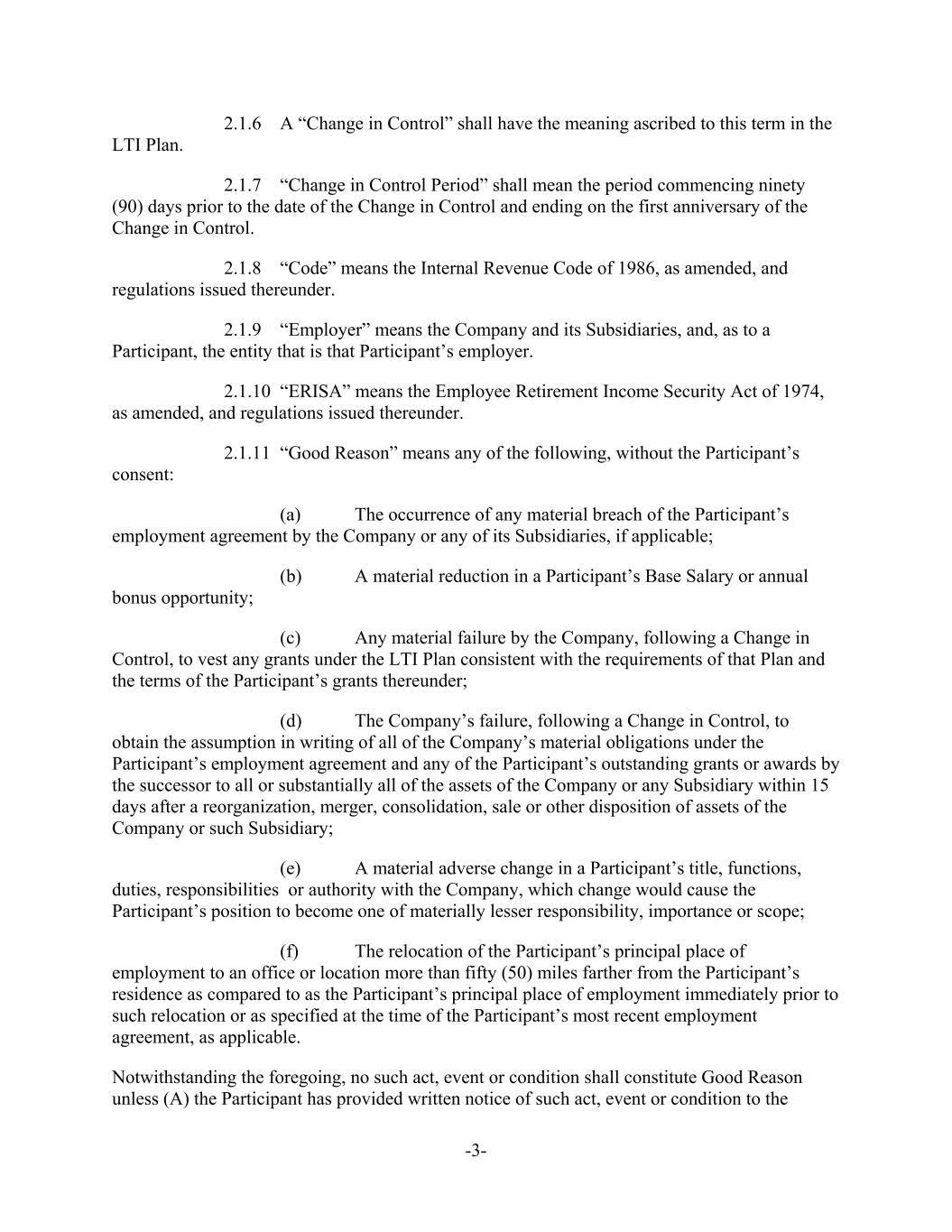 -3- 2.1.6 A “Change in Control” shall have the meaning ascribed to this term in the LTI Plan. 2.1.7 “Change in Control Period” shall mean the period commencing ninety (90) days prior to the date of the Change in Control and ending on the first anniversary of the Change in Control. 2.1.8 “Code” means the Internal Revenue Code of 1986, as amended, and regulations issued thereunder. 2.1.9 “Employer” means the Company and its Subsidiaries, and, as to a Participant, the entity that is that Participant’s employer. 2.1.10 “ERISA” means the Employee Retirement Income Security Act of 1974, as amended, and regulations issued thereunder. 2.1.11 “Good Reason” means any of the following, without the Participant’s consent: (a) The occurrence of any material breach of the Participant’s employment agreement by the Company or any of its Subsidiaries, if applicable; (b) A material reduction in a Participant’s Base Salary or annual bonus opportunity; (c) Any material failure by the Company, following a Change in Control, to vest any grants under the LTI Plan consistent with the requirements of that Plan and the terms of the Participant’s grants thereunder; (d) The Company’s failure, following a Change in Control, to obtain the assumption in writing of all of the Company’s material obligations under the Participant’s employment agreement and any of the Participant’s outstanding grants or awards by the successor to all or substantially all of the assets of the Company or any Subsidiary within 15 days after a reorganization, merger, consolidation, sale or other disposition of assets of the Company or such Subsidiary; (e) A material adverse change in a Participant’s title, functions, duties, responsibilities or authority with the Company, which change would cause the Participant’s position to become one of materially lesser responsibility, importance or scope; (f) The relocation of the Participant’s principal place of employment to an office or location more than fifty (50) miles farther from the Participant’s residence as compared to as the Participant’s principal place of employment immediately prior to such relocation or as specified at the time of the Participant’s most recent employment agreement, as applicable. Notwithstanding the foregoing, no such act, event or condition shall constitute Good Reason unless (A) the Participant has provided written notice of such act, event or condition to the