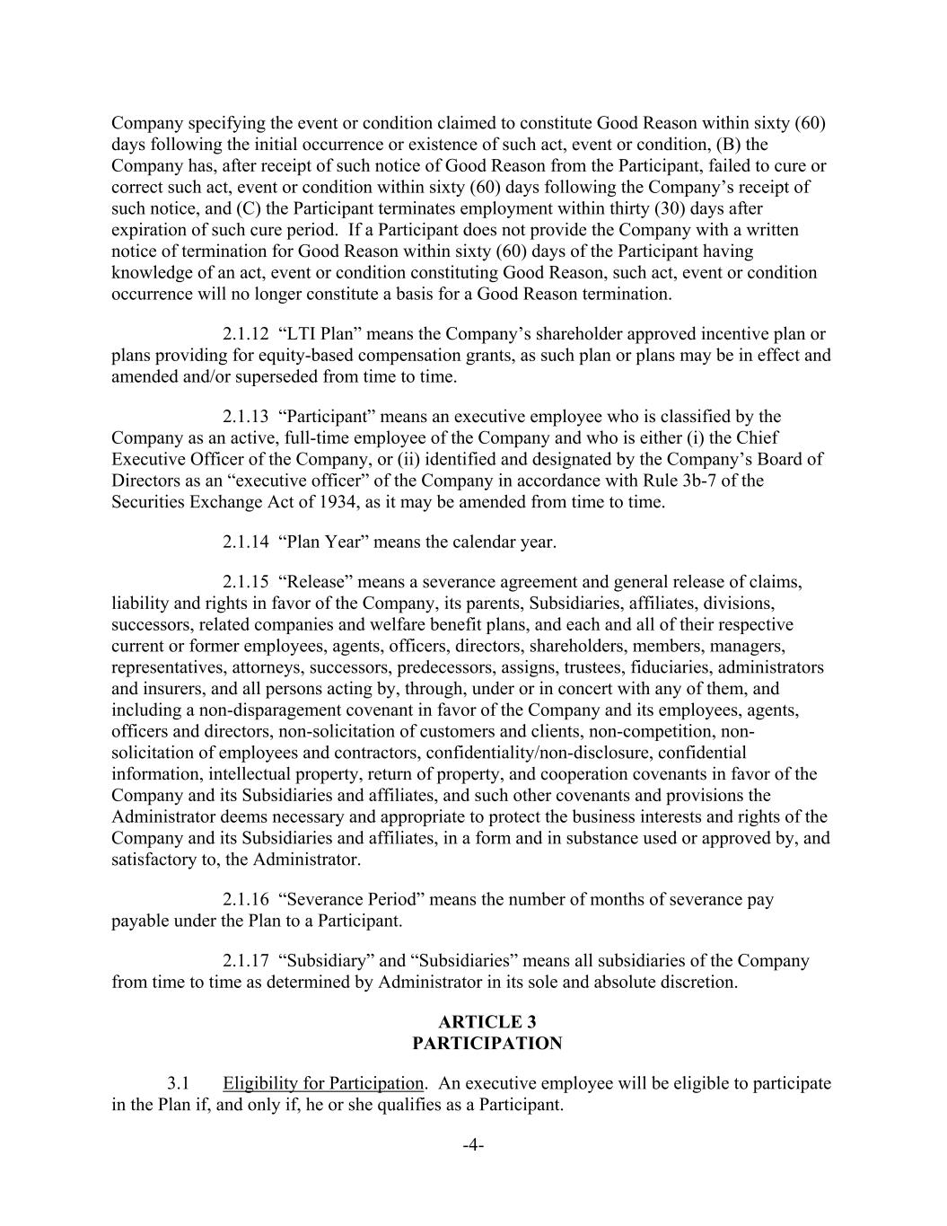 -4- Company specifying the event or condition claimed to constitute Good Reason within sixty (60) days following the initial occurrence or existence of such act, event or condition, (B) the Company has, after receipt of such notice of Good Reason from the Participant, failed to cure or correct such act, event or condition within sixty (60) days following the Company’s receipt of such notice, and (C) the Participant terminates employment within thirty (30) days after expiration of such cure period. If a Participant does not provide the Company with a written notice of termination for Good Reason within sixty (60) days of the Participant having knowledge of an act, event or condition constituting Good Reason, such act, event or condition occurrence will no longer constitute a basis for a Good Reason termination. 2.1.12 “LTI Plan” means the Company’s shareholder approved incentive plan or plans providing for equity-based compensation grants, as such plan or plans may be in effect and amended and/or superseded from time to time. 2.1.13 “Participant” means an executive employee who is classified by the Company as an active, full-time employee of the Company and who is either (i) the Chief Executive Officer of the Company, or (ii) identified and designated by the Company’s Board of Directors as an “executive officer” of the Company in accordance with Rule 3b-7 of the Securities Exchange Act of 1934, as it may be amended from time to time. 2.1.14 “Plan Year” means the calendar year. 2.1.15 “Release” means a severance agreement and general release of claims, liability and rights in favor of the Company, its parents, Subsidiaries, affiliates, divisions, successors, related companies and welfare benefit plans, and each and all of their respective current or former employees, agents, officers, directors, shareholders, members, managers, representatives, attorneys, successors, predecessors, assigns, trustees, fiduciaries, administrators and insurers, and all persons acting by, through, under or in concert with any of them, and including a non-disparagement covenant in favor of the Company and its employees, agents, officers and directors, non-solicitation of customers and clients, non-competition, non- solicitation of employees and contractors, confidentiality/non-disclosure, confidential information, intellectual property, return of property, and cooperation covenants in favor of the Company and its Subsidiaries and affiliates, and such other covenants and provisions the Administrator deems necessary and appropriate to protect the business interests and rights of the Company and its Subsidiaries and affiliates, in a form and in substance used or approved by, and satisfactory to, the Administrator. 2.1.16 “Severance Period” means the number of months of severance pay payable under the Plan to a Participant. 2.1.17 “Subsidiary” and “Subsidiaries” means all subsidiaries of the Company from time to time as determined by Administrator in its sole and absolute discretion. ARTICLE 3 PARTICIPATION 3.1 Eligibility for Participation. An executive employee will be eligible to participate in the Plan if, and only if, he or she qualifies as a Participant.