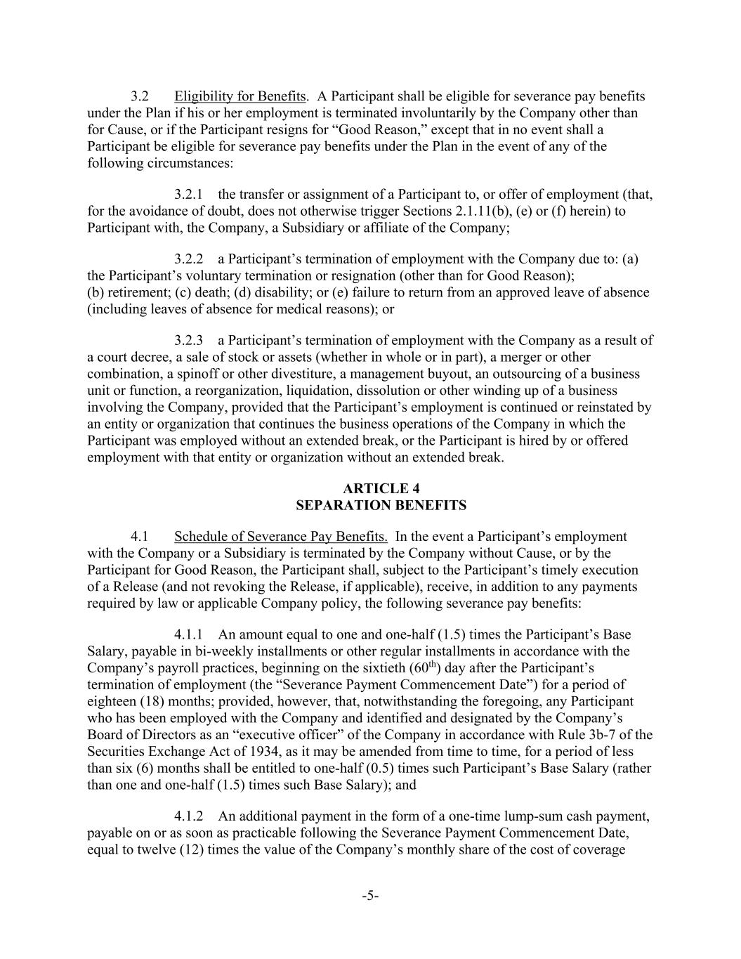 -5- 3.2 Eligibility for Benefits. A Participant shall be eligible for severance pay benefits under the Plan if his or her employment is terminated involuntarily by the Company other than for Cause, or if the Participant resigns for “Good Reason,” except that in no event shall a Participant be eligible for severance pay benefits under the Plan in the event of any of the following circumstances: 3.2.1 the transfer or assignment of a Participant to, or offer of employment (that, for the avoidance of doubt, does not otherwise trigger Sections 2.1.11(b), (e) or (f) herein) to Participant with, the Company, a Subsidiary or affiliate of the Company; 3.2.2 a Participant’s termination of employment with the Company due to: (a) the Participant’s voluntary termination or resignation (other than for Good Reason); (b) retirement; (c) death; (d) disability; or (e) failure to return from an approved leave of absence (including leaves of absence for medical reasons); or 3.2.3 a Participant’s termination of employment with the Company as a result of a court decree, a sale of stock or assets (whether in whole or in part), a merger or other combination, a spinoff or other divestiture, a management buyout, an outsourcing of a business unit or function, a reorganization, liquidation, dissolution or other winding up of a business involving the Company, provided that the Participant’s employment is continued or reinstated by an entity or organization that continues the business operations of the Company in which the Participant was employed without an extended break, or the Participant is hired by or offered employment with that entity or organization without an extended break. ARTICLE 4 SEPARATION BENEFITS 4.1 Schedule of Severance Pay Benefits. In the event a Participant’s employment with the Company or a Subsidiary is terminated by the Company without Cause, or by the Participant for Good Reason, the Participant shall, subject to the Participant’s timely execution of a Release (and not revoking the Release, if applicable), receive, in addition to any payments required by law or applicable Company policy, the following severance pay benefits: 4.1.1 An amount equal to one and one-half (1.5) times the Participant’s Base Salary, payable in bi-weekly installments or other regular installments in accordance with the Company’s payroll practices, beginning on the sixtieth (60th) day after the Participant’s termination of employment (the “Severance Payment Commencement Date”) for a period of eighteen (18) months; provided, however, that, notwithstanding the foregoing, any Participant who has been employed with the Company and identified and designated by the Company’s Board of Directors as an “executive officer” of the Company in accordance with Rule 3b-7 of the Securities Exchange Act of 1934, as it may be amended from time to time, for a period of less than six (6) months shall be entitled to one-half (0.5) times such Participant’s Base Salary (rather than one and one-half (1.5) times such Base Salary); and 4.1.2 An additional payment in the form of a one-time lump-sum cash payment, payable on or as soon as practicable following the Severance Payment Commencement Date, equal to twelve (12) times the value of the Company’s monthly share of the cost of coverage