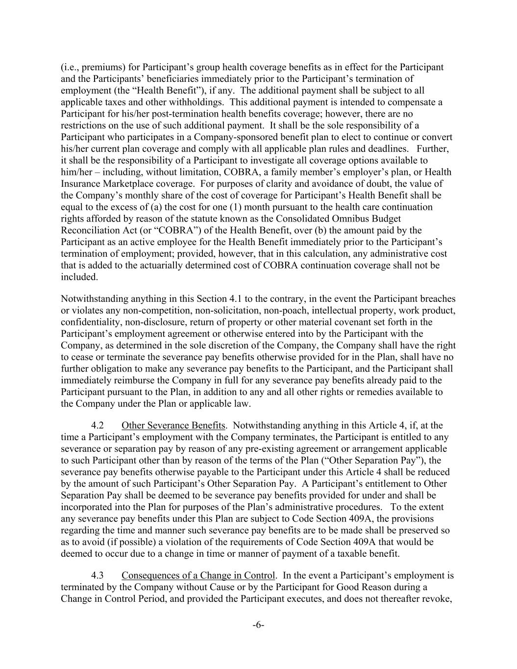 -6- (i.e., premiums) for Participant’s group health coverage benefits as in effect for the Participant and the Participants’ beneficiaries immediately prior to the Participant’s termination of employment (the “Health Benefit”), if any. The additional payment shall be subject to all applicable taxes and other withholdings. This additional payment is intended to compensate a Participant for his/her post-termination health benefits coverage; however, there are no restrictions on the use of such additional payment. It shall be the sole responsibility of a Participant who participates in a Company-sponsored benefit plan to elect to continue or convert his/her current plan coverage and comply with all applicable plan rules and deadlines. Further, it shall be the responsibility of a Participant to investigate all coverage options available to him/her – including, without limitation, COBRA, a family member’s employer’s plan, or Health Insurance Marketplace coverage. For purposes of clarity and avoidance of doubt, the value of the Company’s monthly share of the cost of coverage for Participant’s Health Benefit shall be equal to the excess of (a) the cost for one (1) month pursuant to the health care continuation rights afforded by reason of the statute known as the Consolidated Omnibus Budget Reconciliation Act (or “COBRA”) of the Health Benefit, over (b) the amount paid by the Participant as an active employee for the Health Benefit immediately prior to the Participant’s termination of employment; provided, however, that in this calculation, any administrative cost that is added to the actuarially determined cost of COBRA continuation coverage shall not be included. Notwithstanding anything in this Section 4.1 to the contrary, in the event the Participant breaches or violates any non-competition, non-solicitation, non-poach, intellectual property, work product, confidentiality, non-disclosure, return of property or other material covenant set forth in the Participant’s employment agreement or otherwise entered into by the Participant with the Company, as determined in the sole discretion of the Company, the Company shall have the right to cease or terminate the severance pay benefits otherwise provided for in the Plan, shall have no further obligation to make any severance pay benefits to the Participant, and the Participant shall immediately reimburse the Company in full for any severance pay benefits already paid to the Participant pursuant to the Plan, in addition to any and all other rights or remedies available to the Company under the Plan or applicable law. 4.2 Other Severance Benefits. Notwithstanding anything in this Article 4, if, at the time a Participant’s employment with the Company terminates, the Participant is entitled to any severance or separation pay by reason of any pre-existing agreement or arrangement applicable to such Participant other than by reason of the terms of the Plan (“Other Separation Pay”), the severance pay benefits otherwise payable to the Participant under this Article 4 shall be reduced by the amount of such Participant’s Other Separation Pay. A Participant’s entitlement to Other Separation Pay shall be deemed to be severance pay benefits provided for under and shall be incorporated into the Plan for purposes of the Plan’s administrative procedures. To the extent any severance pay benefits under this Plan are subject to Code Section 409A, the provisions regarding the time and manner such severance pay benefits are to be made shall be preserved so as to avoid (if possible) a violation of the requirements of Code Section 409A that would be deemed to occur due to a change in time or manner of payment of a taxable benefit. 4.3 Consequences of a Change in Control. In the event a Participant’s employment is terminated by the Company without Cause or by the Participant for Good Reason during a Change in Control Period, and provided the Participant executes, and does not thereafter revoke,