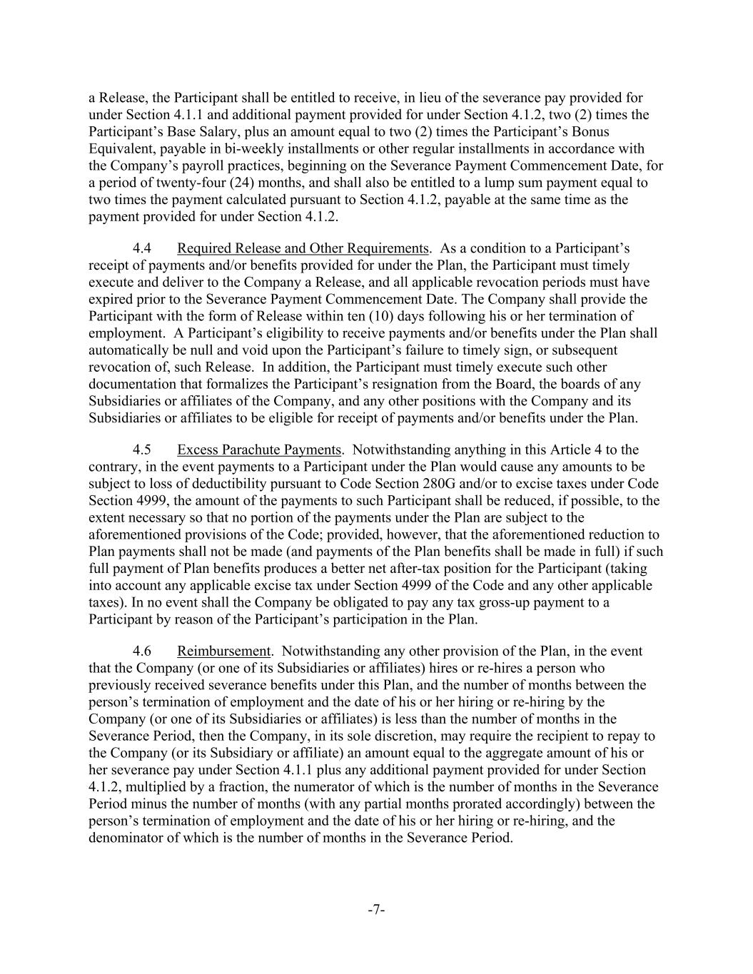 -7- a Release, the Participant shall be entitled to receive, in lieu of the severance pay provided for under Section 4.1.1 and additional payment provided for under Section 4.1.2, two (2) times the Participant’s Base Salary, plus an amount equal to two (2) times the Participant’s Bonus Equivalent, payable in bi-weekly installments or other regular installments in accordance with the Company’s payroll practices, beginning on the Severance Payment Commencement Date, for a period of twenty-four (24) months, and shall also be entitled to a lump sum payment equal to two times the payment calculated pursuant to Section 4.1.2, payable at the same time as the payment provided for under Section 4.1.2. 4.4 Required Release and Other Requirements. As a condition to a Participant’s receipt of payments and/or benefits provided for under the Plan, the Participant must timely execute and deliver to the Company a Release, and all applicable revocation periods must have expired prior to the Severance Payment Commencement Date. The Company shall provide the Participant with the form of Release within ten (10) days following his or her termination of employment. A Participant’s eligibility to receive payments and/or benefits under the Plan shall automatically be null and void upon the Participant’s failure to timely sign, or subsequent revocation of, such Release. In addition, the Participant must timely execute such other documentation that formalizes the Participant’s resignation from the Board, the boards of any Subsidiaries or affiliates of the Company, and any other positions with the Company and its Subsidiaries or affiliates to be eligible for receipt of payments and/or benefits under the Plan. 4.5 Excess Parachute Payments. Notwithstanding anything in this Article 4 to the contrary, in the event payments to a Participant under the Plan would cause any amounts to be subject to loss of deductibility pursuant to Code Section 280G and/or to excise taxes under Code Section 4999, the amount of the payments to such Participant shall be reduced, if possible, to the extent necessary so that no portion of the payments under the Plan are subject to the aforementioned provisions of the Code; provided, however, that the aforementioned reduction to Plan payments shall not be made (and payments of the Plan benefits shall be made in full) if such full payment of Plan benefits produces a better net after-tax position for the Participant (taking into account any applicable excise tax under Section 4999 of the Code and any other applicable taxes). In no event shall the Company be obligated to pay any tax gross-up payment to a Participant by reason of the Participant’s participation in the Plan. 4.6 Reimbursement. Notwithstanding any other provision of the Plan, in the event that the Company (or one of its Subsidiaries or affiliates) hires or re-hires a person who previously received severance benefits under this Plan, and the number of months between the person’s termination of employment and the date of his or her hiring or re-hiring by the Company (or one of its Subsidiaries or affiliates) is less than the number of months in the Severance Period, then the Company, in its sole discretion, may require the recipient to repay to the Company (or its Subsidiary or affiliate) an amount equal to the aggregate amount of his or her severance pay under Section 4.1.1 plus any additional payment provided for under Section 4.1.2, multiplied by a fraction, the numerator of which is the number of months in the Severance Period minus the number of months (with any partial months prorated accordingly) between the person’s termination of employment and the date of his or her hiring or re-hiring, and the denominator of which is the number of months in the Severance Period.