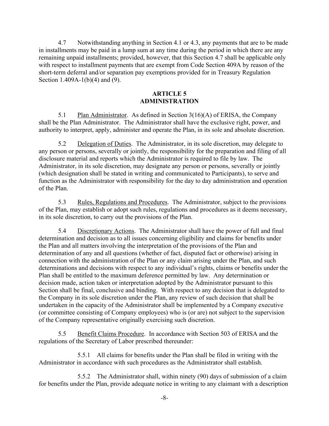 -8- 4.7 Notwithstanding anything in Section 4.1 or 4.3, any payments that are to be made in installments may be paid in a lump sum at any time during the period in which there are any remaining unpaid installments; provided, however, that this Section 4.7 shall be applicable only with respect to installment payments that are exempt from Code Section 409A by reason of the short-term deferral and/or separation pay exemptions provided for in Treasury Regulation Section 1.409A-1(b)(4) and (9). ARTICLE 5 ADMINISTRATION 5.1 Plan Administrator. As defined in Section 3(16)(A) of ERISA, the Company shall be the Plan Administrator. The Administrator shall have the exclusive right, power, and authority to interpret, apply, administer and operate the Plan, in its sole and absolute discretion. 5.2 Delegation of Duties. The Administrator, in its sole discretion, may delegate to any person or persons, severally or jointly, the responsibility for the preparation and filing of all disclosure material and reports which the Administrator is required to file by law. The Administrator, in its sole discretion, may designate any person or persons, severally or jointly (which designation shall be stated in writing and communicated to Participants), to serve and function as the Administrator with responsibility for the day to day administration and operation of the Plan. 5.3 Rules, Regulations and Procedures. The Administrator, subject to the provisions of the Plan, may establish or adopt such rules, regulations and procedures as it deems necessary, in its sole discretion, to carry out the provisions of the Plan. 5.4 Discretionary Actions. The Administrator shall have the power of full and final determination and decision as to all issues concerning eligibility and claims for benefits under the Plan and all matters involving the interpretation of the provisions of the Plan and determination of any and all questions (whether of fact, disputed fact or otherwise) arising in connection with the administration of the Plan or any claim arising under the Plan, and such determinations and decisions with respect to any individual’s rights, claims or benefits under the Plan shall be entitled to the maximum deference permitted by law. Any determination or decision made, action taken or interpretation adopted by the Administrator pursuant to this Section shall be final, conclusive and binding. With respect to any decision that is delegated to the Company in its sole discretion under the Plan, any review of such decision that shall be undertaken in the capacity of the Administrator shall be implemented by a Company executive (or committee consisting of Company employees) who is (or are) not subject to the supervision of the Company representative originally exercising such discretion. 5.5 Benefit Claims Procedure. In accordance with Section 503 of ERISA and the regulations of the Secretary of Labor prescribed thereunder: 5.5.1 All claims for benefits under the Plan shall be filed in writing with the Administrator in accordance with such procedures as the Administrator shall establish. 5.5.2 The Administrator shall, within ninety (90) days of submission of a claim for benefits under the Plan, provide adequate notice in writing to any claimant with a description
