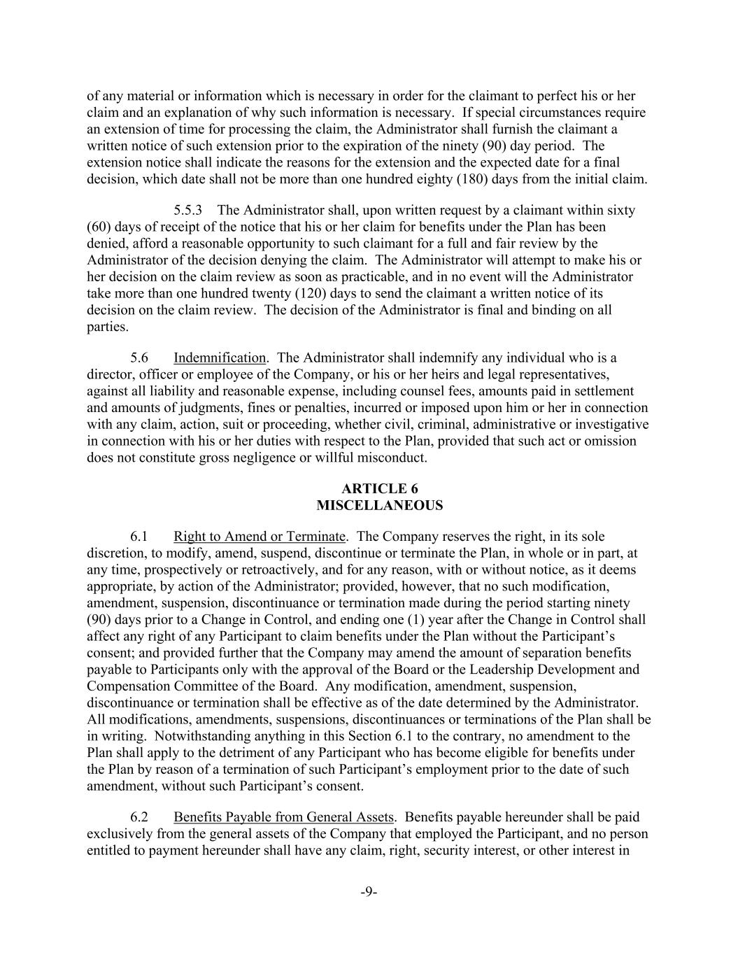 -9- of any material or information which is necessary in order for the claimant to perfect his or her claim and an explanation of why such information is necessary. If special circumstances require an extension of time for processing the claim, the Administrator shall furnish the claimant a written notice of such extension prior to the expiration of the ninety (90) day period. The extension notice shall indicate the reasons for the extension and the expected date for a final decision, which date shall not be more than one hundred eighty (180) days from the initial claim. 5.5.3 The Administrator shall, upon written request by a claimant within sixty (60) days of receipt of the notice that his or her claim for benefits under the Plan has been denied, afford a reasonable opportunity to such claimant for a full and fair review by the Administrator of the decision denying the claim. The Administrator will attempt to make his or her decision on the claim review as soon as practicable, and in no event will the Administrator take more than one hundred twenty (120) days to send the claimant a written notice of its decision on the claim review. The decision of the Administrator is final and binding on all parties. 5.6 Indemnification. The Administrator shall indemnify any individual who is a director, officer or employee of the Company, or his or her heirs and legal representatives, against all liability and reasonable expense, including counsel fees, amounts paid in settlement and amounts of judgments, fines or penalties, incurred or imposed upon him or her in connection with any claim, action, suit or proceeding, whether civil, criminal, administrative or investigative in connection with his or her duties with respect to the Plan, provided that such act or omission does not constitute gross negligence or willful misconduct. ARTICLE 6 MISCELLANEOUS 6.1 Right to Amend or Terminate. The Company reserves the right, in its sole discretion, to modify, amend, suspend, discontinue or terminate the Plan, in whole or in part, at any time, prospectively or retroactively, and for any reason, with or without notice, as it deems appropriate, by action of the Administrator; provided, however, that no such modification, amendment, suspension, discontinuance or termination made during the period starting ninety (90) days prior to a Change in Control, and ending one (1) year after the Change in Control shall affect any right of any Participant to claim benefits under the Plan without the Participant’s consent; and provided further that the Company may amend the amount of separation benefits payable to Participants only with the approval of the Board or the Leadership Development and Compensation Committee of the Board. Any modification, amendment, suspension, discontinuance or termination shall be effective as of the date determined by the Administrator. All modifications, amendments, suspensions, discontinuances or terminations of the Plan shall be in writing. Notwithstanding anything in this Section 6.1 to the contrary, no amendment to the Plan shall apply to the detriment of any Participant who has become eligible for benefits under the Plan by reason of a termination of such Participant’s employment prior to the date of such amendment, without such Participant’s consent. 6.2 Benefits Payable from General Assets. Benefits payable hereunder shall be paid exclusively from the general assets of the Company that employed the Participant, and no person entitled to payment hereunder shall have any claim, right, security interest, or other interest in