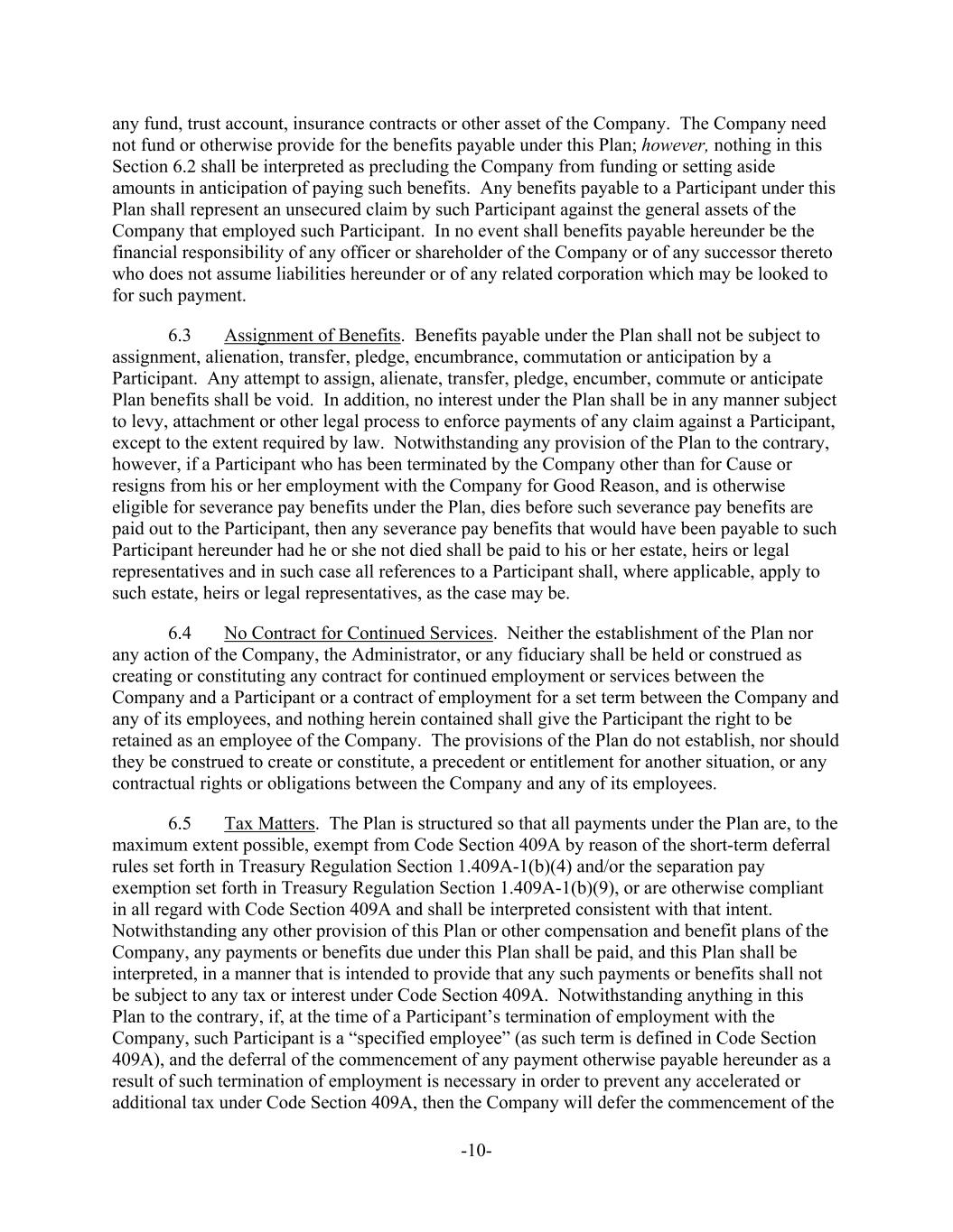 -10- any fund, trust account, insurance contracts or other asset of the Company. The Company need not fund or otherwise provide for the benefits payable under this Plan; however, nothing in this Section 6.2 shall be interpreted as precluding the Company from funding or setting aside amounts in anticipation of paying such benefits. Any benefits payable to a Participant under this Plan shall represent an unsecured claim by such Participant against the general assets of the Company that employed such Participant. In no event shall benefits payable hereunder be the financial responsibility of any officer or shareholder of the Company or of any successor thereto who does not assume liabilities hereunder or of any related corporation which may be looked to for such payment. 6.3 Assignment of Benefits. Benefits payable under the Plan shall not be subject to assignment, alienation, transfer, pledge, encumbrance, commutation or anticipation by a Participant. Any attempt to assign, alienate, transfer, pledge, encumber, commute or anticipate Plan benefits shall be void. In addition, no interest under the Plan shall be in any manner subject to levy, attachment or other legal process to enforce payments of any claim against a Participant, except to the extent required by law. Notwithstanding any provision of the Plan to the contrary, however, if a Participant who has been terminated by the Company other than for Cause or resigns from his or her employment with the Company for Good Reason, and is otherwise eligible for severance pay benefits under the Plan, dies before such severance pay benefits are paid out to the Participant, then any severance pay benefits that would have been payable to such Participant hereunder had he or she not died shall be paid to his or her estate, heirs or legal representatives and in such case all references to a Participant shall, where applicable, apply to such estate, heirs or legal representatives, as the case may be. 6.4 No Contract for Continued Services. Neither the establishment of the Plan nor any action of the Company, the Administrator, or any fiduciary shall be held or construed as creating or constituting any contract for continued employment or services between the Company and a Participant or a contract of employment for a set term between the Company and any of its employees, and nothing herein contained shall give the Participant the right to be retained as an employee of the Company. The provisions of the Plan do not establish, nor should they be construed to create or constitute, a precedent or entitlement for another situation, or any contractual rights or obligations between the Company and any of its employees. 6.5 Tax Matters. The Plan is structured so that all payments under the Plan are, to the maximum extent possible, exempt from Code Section 409A by reason of the short-term deferral rules set forth in Treasury Regulation Section 1.409A-1(b)(4) and/or the separation pay exemption set forth in Treasury Regulation Section 1.409A-1(b)(9), or are otherwise compliant in all regard with Code Section 409A and shall be interpreted consistent with that intent. Notwithstanding any other provision of this Plan or other compensation and benefit plans of the Company, any payments or benefits due under this Plan shall be paid, and this Plan shall be interpreted, in a manner that is intended to provide that any such payments or benefits shall not be subject to any tax or interest under Code Section 409A. Notwithstanding anything in this Plan to the contrary, if, at the time of a Participant’s termination of employment with the Company, such Participant is a “specified employee” (as such term is defined in Code Section 409A), and the deferral of the commencement of any payment otherwise payable hereunder as a result of such termination of employment is necessary in order to prevent any accelerated or additional tax under Code Section 409A, then the Company will defer the commencement of the