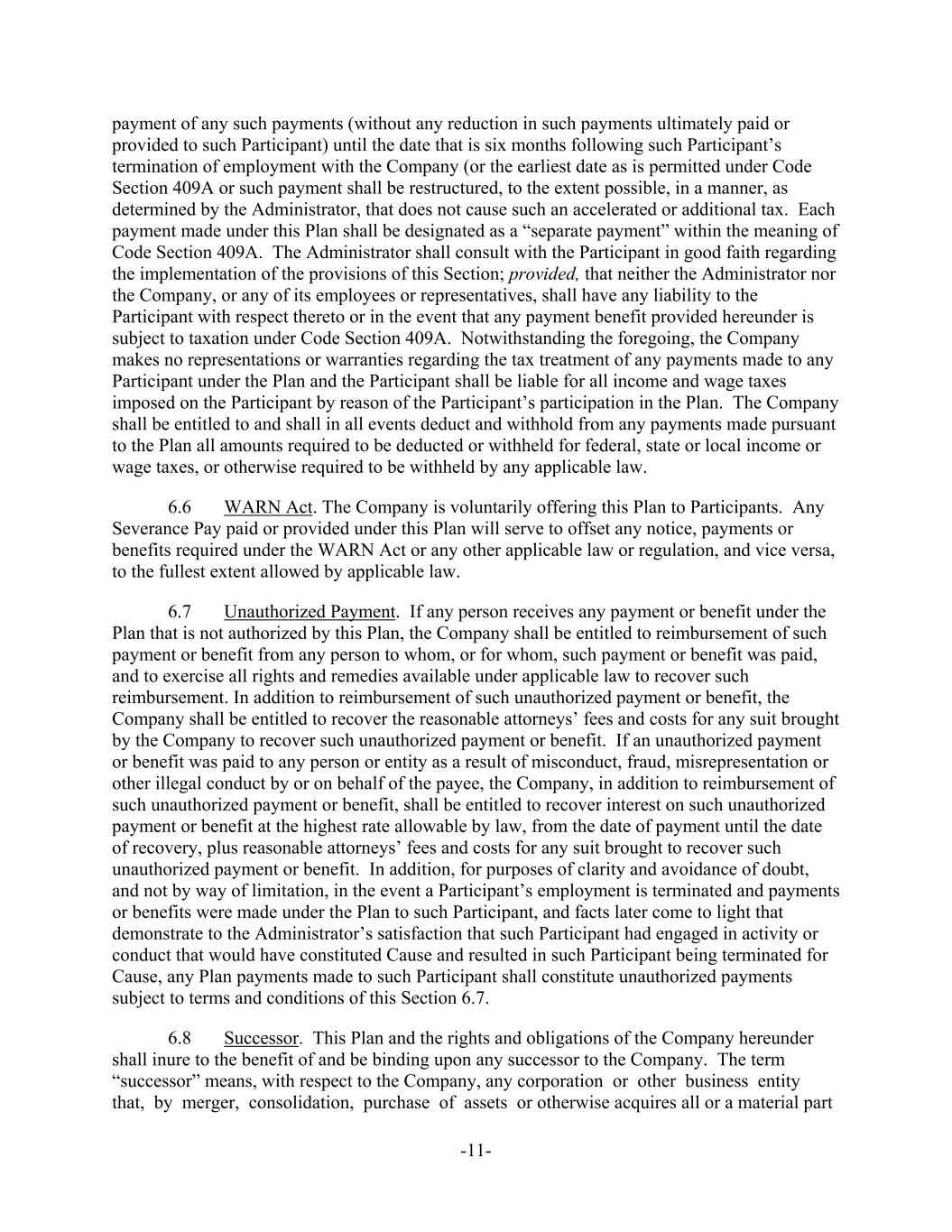 -11- payment of any such payments (without any reduction in such payments ultimately paid or provided to such Participant) until the date that is six months following such Participant’s termination of employment with the Company (or the earliest date as is permitted under Code Section 409A or such payment shall be restructured, to the extent possible, in a manner, as determined by the Administrator, that does not cause such an accelerated or additional tax. Each payment made under this Plan shall be designated as a “separate payment” within the meaning of Code Section 409A. The Administrator shall consult with the Participant in good faith regarding the implementation of the provisions of this Section; provided, that neither the Administrator nor the Company, or any of its employees or representatives, shall have any liability to the Participant with respect thereto or in the event that any payment benefit provided hereunder is subject to taxation under Code Section 409A. Notwithstanding the foregoing, the Company makes no representations or warranties regarding the tax treatment of any payments made to any Participant under the Plan and the Participant shall be liable for all income and wage taxes imposed on the Participant by reason of the Participant’s participation in the Plan. The Company shall be entitled to and shall in all events deduct and withhold from any payments made pursuant to the Plan all amounts required to be deducted or withheld for federal, state or local income or wage taxes, or otherwise required to be withheld by any applicable law. 6.6 WARN Act. The Company is voluntarily offering this Plan to Participants. Any Severance Pay paid or provided under this Plan will serve to offset any notice, payments or benefits required under the WARN Act or any other applicable law or regulation, and vice versa, to the fullest extent allowed by applicable law. 6.7 Unauthorized Payment. If any person receives any payment or benefit under the Plan that is not authorized by this Plan, the Company shall be entitled to reimbursement of such payment or benefit from any person to whom, or for whom, such payment or benefit was paid, and to exercise all rights and remedies available under applicable law to recover such reimbursement. In addition to reimbursement of such unauthorized payment or benefit, the Company shall be entitled to recover the reasonable attorneys’ fees and costs for any suit brought by the Company to recover such unauthorized payment or benefit. If an unauthorized payment or benefit was paid to any person or entity as a result of misconduct, fraud, misrepresentation or other illegal conduct by or on behalf of the payee, the Company, in addition to reimbursement of such unauthorized payment or benefit, shall be entitled to recover interest on such unauthorized payment or benefit at the highest rate allowable by law, from the date of payment until the date of recovery, plus reasonable attorneys’ fees and costs for any suit brought to recover such unauthorized payment or benefit. In addition, for purposes of clarity and avoidance of doubt, and not by way of limitation, in the event a Participant’s employment is terminated and payments or benefits were made under the Plan to such Participant, and facts later come to light that demonstrate to the Administrator’s satisfaction that such Participant had engaged in activity or conduct that would have constituted Cause and resulted in such Participant being terminated for Cause, any Plan payments made to such Participant shall constitute unauthorized payments subject to terms and conditions of this Section 6.7. 6.8 Successor. This Plan and the rights and obligations of the Company hereunder shall inure to the benefit of and be binding upon any successor to the Company. The term “successor” means, with respect to the Company, any corporation or other business entity that, by merger, consolidation, purchase of assets or otherwise acquires all or a material part