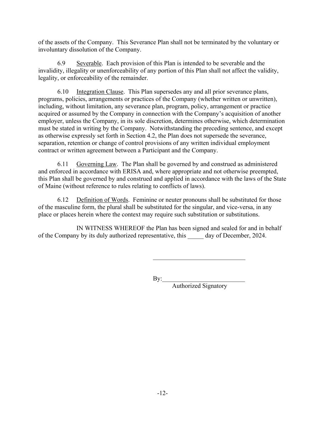 -12- of the assets of the Company. This Severance Plan shall not be terminated by the voluntary or involuntary dissolution of the Company. 6.9 Severable. Each provision of this Plan is intended to be severable and the invalidity, illegality or unenforceability of any portion of this Plan shall not affect the validity, legality, or enforceability of the remainder. 6.10 Integration Clause. This Plan supersedes any and all prior severance plans, programs, policies, arrangements or practices of the Company (whether written or unwritten), including, without limitation, any severance plan, program, policy, arrangement or practice acquired or assumed by the Company in connection with the Company’s acquisition of another employer, unless the Company, in its sole discretion, determines otherwise, which determination must be stated in writing by the Company. Notwithstanding the preceding sentence, and except as otherwise expressly set forth in Section 4.2, the Plan does not supersede the severance, separation, retention or change of control provisions of any written individual employment contract or written agreement between a Participant and the Company. 6.11 Governing Law. The Plan shall be governed by and construed as administered and enforced in accordance with ERISA and, where appropriate and not otherwise preempted, this Plan shall be governed by and construed and applied in accordance with the laws of the State of Maine (without reference to rules relating to conflicts of laws). 6.12 Definition of Words. Feminine or neuter pronouns shall be substituted for those of the masculine form, the plural shall be substituted for the singular, and vice-versa, in any place or places herein where the context may require such substitution or substitutions. IN WITNESS WHEREOF the Plan has been signed and sealed for and in behalf of the Company by its duly authorized representative, this _____ day of December, 2024. _____________________________ By:__________________________ Authorized Signatory