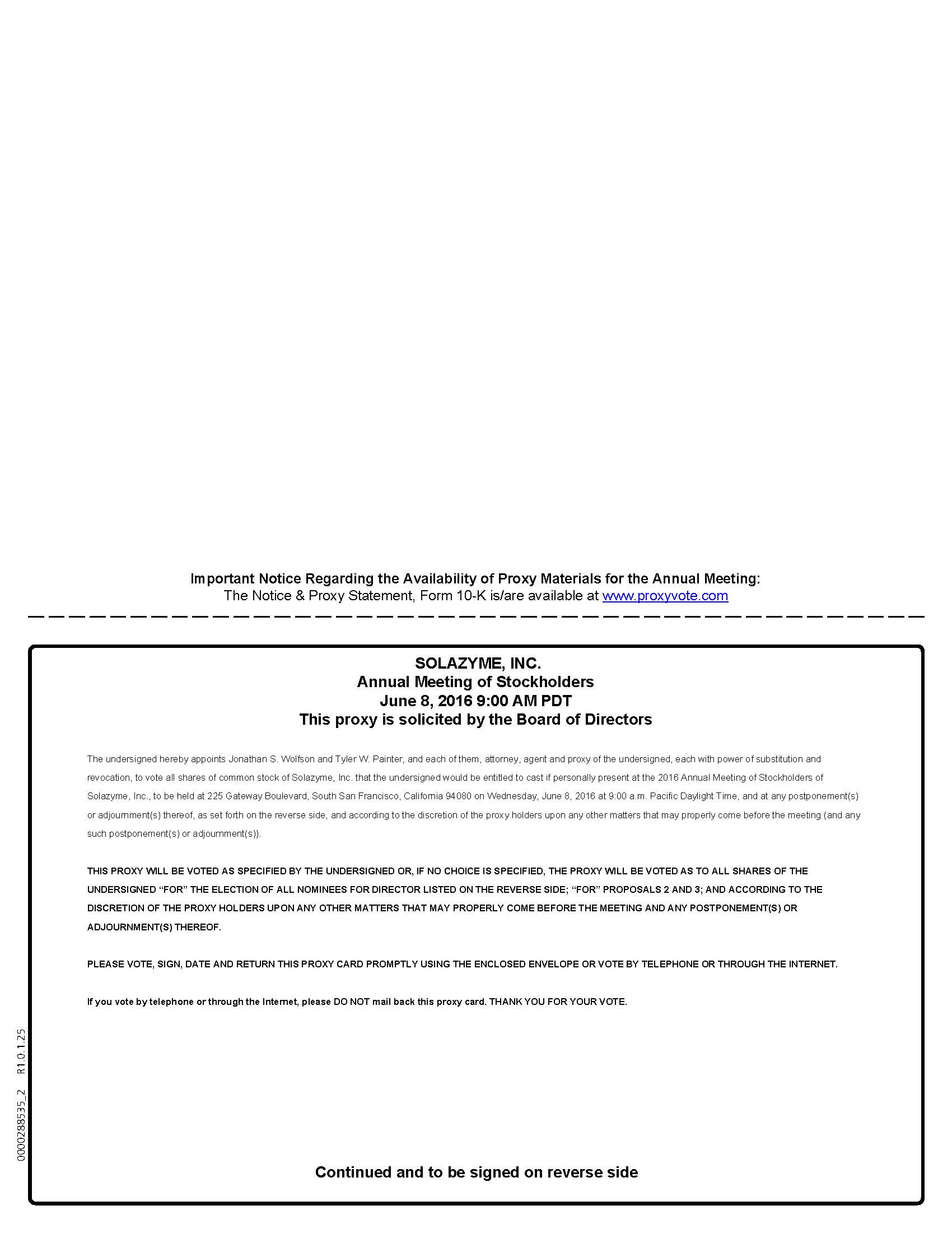 We cordially invite you to attend Solazyme’s 2016 Annual Meeting of Stockholders (Annual Meeting) at our corporate headquarters located at 225 Gateway Boulevard, South San Francisco, CA 94080, on Wednesday, June 8, 2016 at 9:00 a.m. Pacific Daylight Time. At the meeting, holders of our common stock and holders of our Series A Convertible Preferred Stock will: