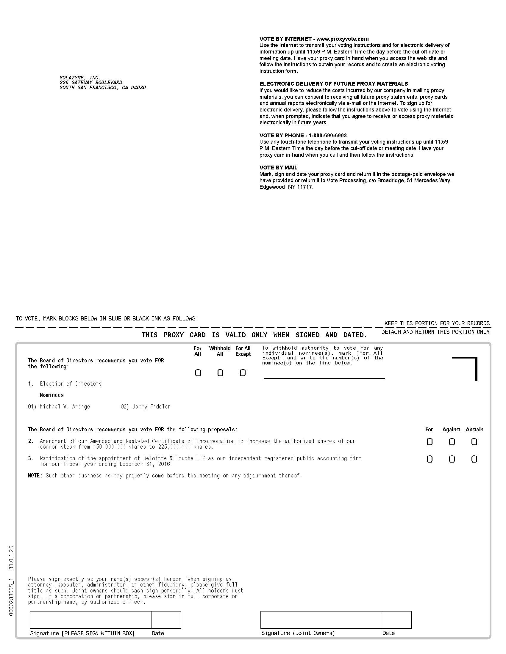 We cordially invite you to attend Solazyme’s 2016 Annual Meeting of Stockholders (Annual Meeting) at our corporate headquarters located at 225 Gateway Boulevard, South San Francisco, CA 94080, on Wednesday, June 8, 2016 at 9:00 a.m. Pacific Daylight Time. At the meeting, holders of our common stock and holders of our Series A Convertible Preferred Stock will: