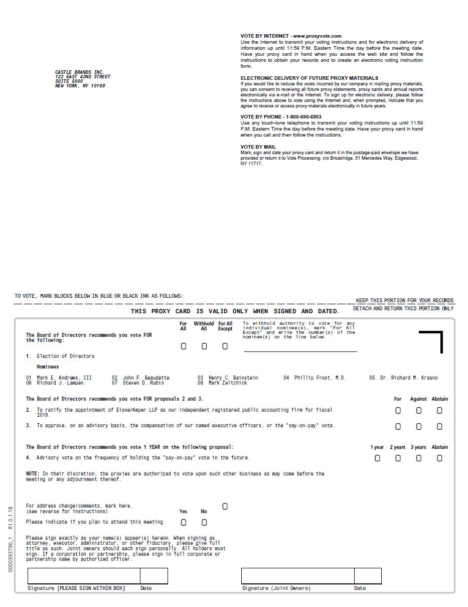 If you need directions to the location of the meeting, please contact our Investor Relations Department by: (a) mail at Castle Brands Inc., Attention: Investor Relations, 122 East 42nd Street, Suite 5000, New York, New York 10168, (b) telephone at (646) 356-0200 or (c) e-mail at ir@castlebrandsinc.com.