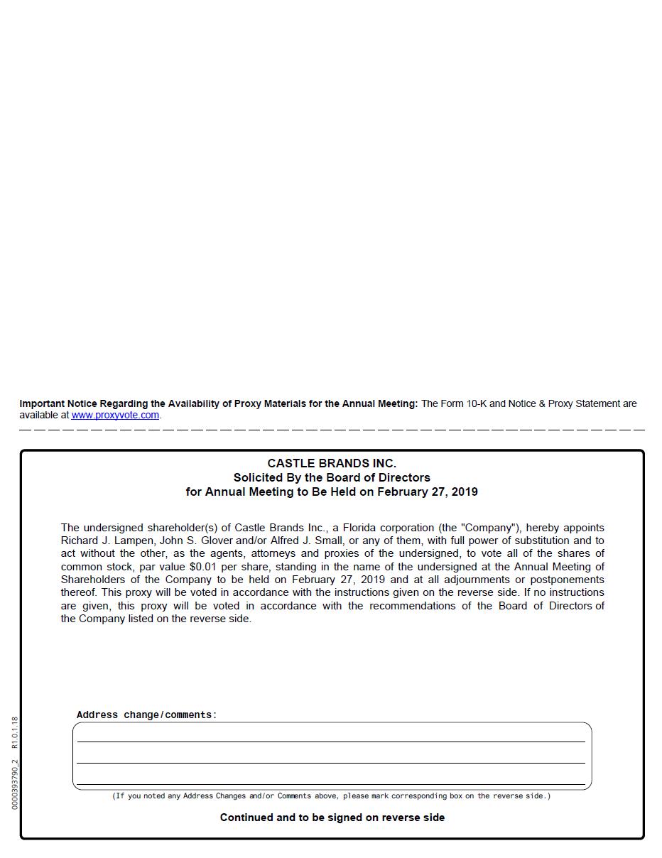 Castle Brands Inc. will hold its 2018 annual meeting of shareholders at the offices of Ladenburg Thalmann & Co. Inc., located at 277 Park Avenue, 26th Floor, New York, NY 10172, on February 27, 2019 at 10:00 a.m., for the following purposes, as further described in the attached proxy statement: