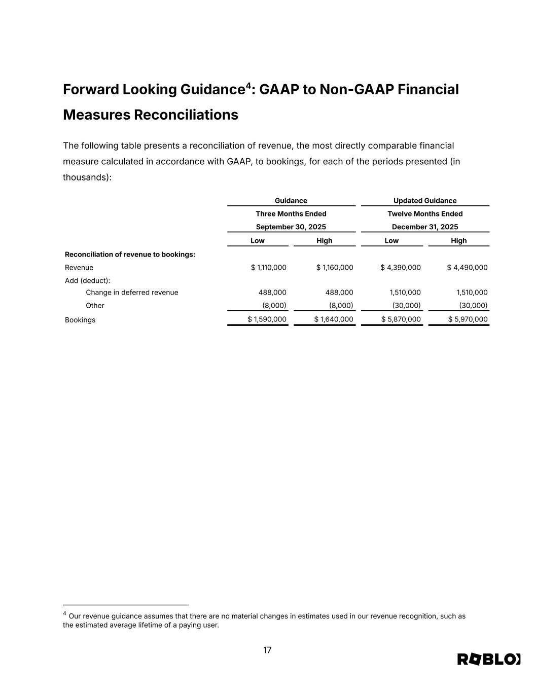 Forward Looking Guidance4: GAAP to Non-GAAP Financial Measures Reconciliations The following table presents a reconciliation of revenue, the most directly comparable financial measure calculated in accordance with GAAP, to bookings, for each of the periods presented (in thousands): Guidance Updated Guidance Three Months Ended Twelve Months Ended September 30, 2025 December 31, 2025 Low High Low High Reconciliation of revenue to bookings: Revenue $ 1,110,000 $ 1,160,000 $ 4,390,000 $ 4,490,000 Add (deduct): Change in deferred revenue 488,000 488,000 1,510,000 1,510,000 Other 8,000 8,000 30,000 30,000 Bookings $ 1,590,000 $ 1,640,000 $ 5,870,000 $ 5,970,000 4 Our revenue guidance assumes that there are no material changes in estimates used in our revenue recognition, such as the estimated average lifetime of a paying user. 17