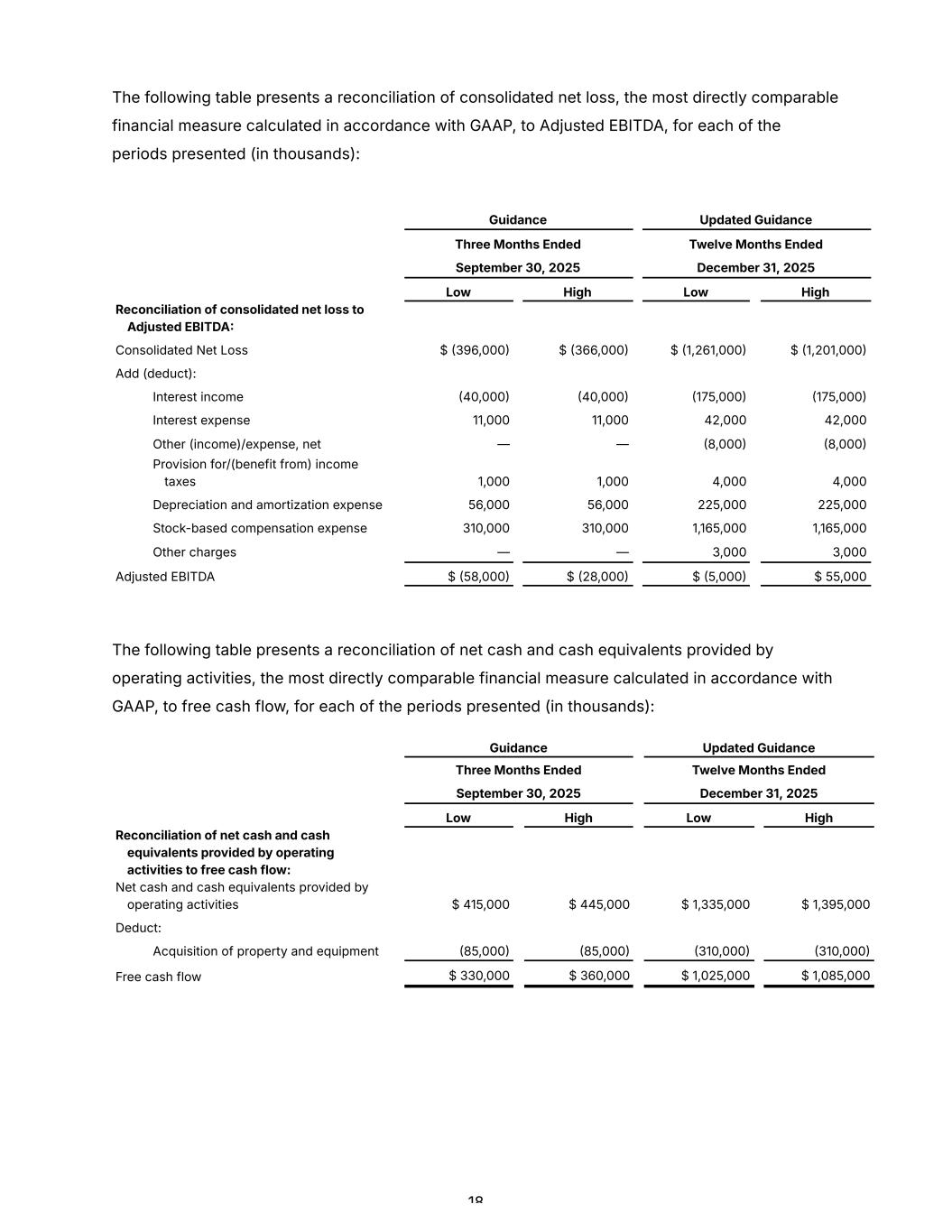The following table presents a reconciliation of consolidated net loss, the most directly comparable financial measure calculated in accordance with GAAP, to Adjusted EBITDA, for each of the periods presented (in thousands): Guidance Updated Guidance Three Months Ended Twelve Months Ended September 30, 2025 December 31, 2025 Low High Low High Reconciliation of consolidated net loss to Adjusted EBITDA Consolidated Net Loss $ 396,000 $ 366,000 $ 1,261,000 $ 1,201,000 Add (deduct): Interest income 40,000 40,000 175,000 175,000 Interest expense 11,000 11,000 42,000 42,000 Other (income)/expense, net — — 8,000 8,000 Provision for/(benefit from) income taxes 1,000 1,000 4,000 4,000 Depreciation and amortization expense 56,000 56,000 225,000 225,000 Stock-based compensation expense 310,000 310,000 1,165,000 1,165,000 Other charges — — 3,000 3,000 Adjusted EBITDA $ 58,000 $ 28,000 $ 5,000 $ 55,000 The following table presents a reconciliation of net cash and cash equivalents provided by operating activities, the most directly comparable financial measure calculated in accordance with GAAP, to free cash flow, for each of the periods presented (in thousands): Guidance Updated Guidance Three Months Ended Twelve Months Ended September 30, 2025 December 31, 2025 Low High Low High Reconciliation of net cash and cash equivalents provided by operating activities to free cash flow: Net cash and cash equivalents provided by operating activities $ 415,000 $ 445,000 $ 1,335,000 $ 1,395,000 Deduct: Acquisition of property and equipment 85,000 85,000 310,000 310,000 Free cash flow $ 330,000 $ 360,000 $ 1,025,000 $ 1,085,000 18
