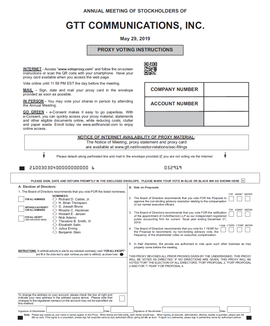 ANNUAL MEETING OF STOCKHOLDERS OF GTT COMMUNICATIONS, May 29, 2019 INC. INTERNET - Access “www.voteproxy.com” and follow the on-screen instructions or scan the QR code with your smartphone. Have your proxy card available when you access the web page. Vote online until 11:59 PM EST the day before the meeting. MAIL - Sign, date and mail your proxy card in the envelope provided as soon as possible. IN PERSON - You may vote your shares in person by attending the Annual Meeting. GO GREEN - e-Consent makes it easy to go paperless. With e-Consent, you can quickly access your proxy material, statements and other eligible documents online, while reducing costs, clutter and paper waste. Enroll today via www.astfinancial.com to enjoy online access. Please detach along perforated line and mail in the envelope provided IF you are not voting via the Internet. 21003030400000000000 6 052919 approve the non-binding advisory resolution relating to the compensation 3. The Board of Directors recommends that you vote FOR the ratification public accounting firm for current fiscal year ending December 31, 1 YEAR 2 YEARS 3 YEARS ABSTAIN frequency of the shareholder votes on executive compensation. changes to the registered name(s) on the account may not be submitted via Note: Please sign exactly as your name or names appear on this Proxy. When shares are held jointly, each holder should sign. When signing as executor, administrator, attorney, trustee or guardian, please give full title as such. If the signer is a corporation, please sign full corporate name by duly authorized officer, giving full title as such. If signer is a partnership, please sign in partnership name by authorized person. PLEASE SIGN, DATE AND RETURN PROMPTLY IN THE ENCLOSED ENVELOPE. PLEASE MARK YOUR VOTE IN BLUE OR BLACK INK AS SHOWN HERE x A. Election of Directors: 1. The Board of Directors recommends that you vote FOR the listed nominees. NOMINEES: FOR ALL NOMINEESO Richard D. Calder, Jr. O H. Brian Thompson WITHHOLD AUTHORITYO S. Joseph Bruno FOR ALL NOMINEESO Rhodric C. Hackman O Howard E. Janzen FOR ALL EXCEPTO Nick Adamo (See instructions below)O Theodore B. Smith, III O Elizabeth Satin O Julius Erving O Benjamin Stein INSTRUCTIONS: To withhold authority to vote for any individual nominee(s), mark “FOR ALL EXCEPT” and fill in the circle next to each nominee you wish to withhold, as shown here: B. Vote on Proposals FOR AGAINST ABSTAIN 2. The Board of Directors recommends that you vote FOR the Proposal to of our named executive officers. FOR AGAINST ABSTAIN of the appointment of CohnReznick LLP as our independent registered 2019. 4. The Board of Directors recommends that you vote for 1 YEAR for the Proposal to recommend, by non-binding advisory vote, the 5. In their discretion, the proxies are authorized to vote upon such other business as may properly come before the meeting. THIS PROXY REVOKES ALL PRIOR PROXIES GIVEN BY THE UNDERSIGNED. THIS PROXY WILL BE VOTED AS DIRECTED. IF NO DIRECTIONS ARE GIVEN, THIS PROXY WILL BE VOTED "FOR" THE ELECTION OF ALL DIRECTORS, "FOR" PROPOSAL 2, "FOR" PROPOSAL 3 AND FOR “1 YEAR” FOR PROPOSAL 4. To change the address on your account, please check the box at right and indicate your new address in the address space above. Please note that this method. Signature of Stockholder Date: Signature of StockholderDate: NOTICE OF INTERNET AVAILABILITY OF PROXY MATERIAL: The Notice of Meeting, proxy statement and proxy card are available at www.gtt.net/investor-relations/sec-filings COMPANY NUMBER ACCOUNT NUMBER PROXY VOTING INSTRUCTIONS