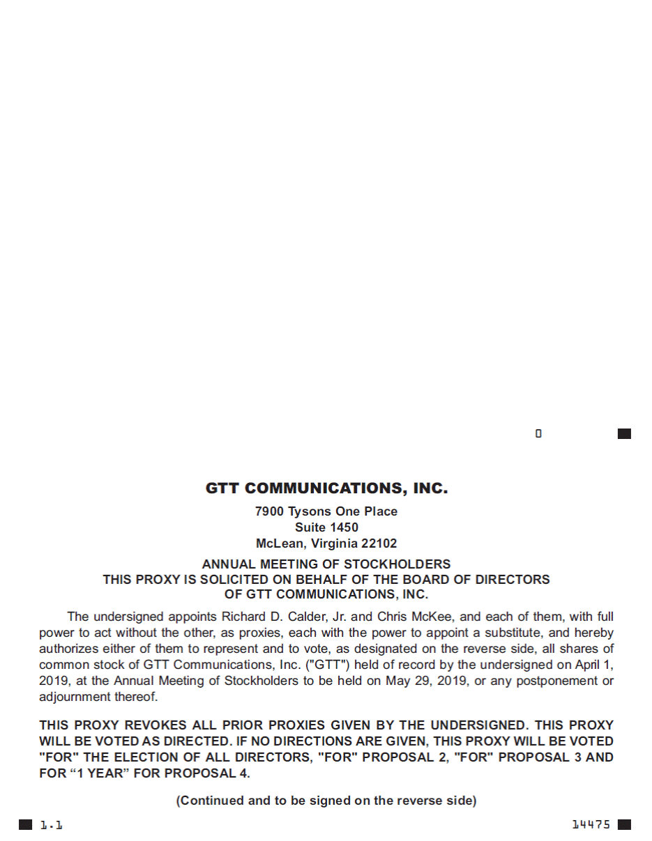 - 0 GTT COMMUNICATIONS, INC. 7900 Tysons One Place Suite 1450 McLean, Virginia 22102 ANNUAL MEETING OF STOCKHOLDERS THIS PROXY IS SOLICITED ON BEHALF OF THE BOARD OF DIRECTORS OF GTT COMMUNICATIONS, INC. The undersigned appoints Richard D. Calder, Jr. and Chris McKee, and each of them, with full power to act without the other, as proxies, each with the power to appoint a substitute, and hereby authorizes either of them to represent and to vote, as designated on the reverse side, all shares of common stock of GTT Communications, Inc. ("GTT") held of record by the undersigned on April 1, 2019, at the Annual Meeting of Stockholders to be held on May 29, 2019, or any postponement or adjournment thereof. THIS PROXY REVOKES ALL PRIOR PROXIES GIVEN BY THE UNDERSIGNED. THIS PROXY WILL BE VOTED AS DIRECTED. IF NO DIRECTIONS ARE GIVEN, THIS PROXY WILL BE VOTED "FOR" THE ELECTION OF ALL DIRECTORS, "FOR" PROPOSAL 2, "FOR" PROPOSAL 3 AND FOR “1 YEAR” FOR PROPOSAL 4. (Continued and to be signed on the reverse side) 14475 1.1