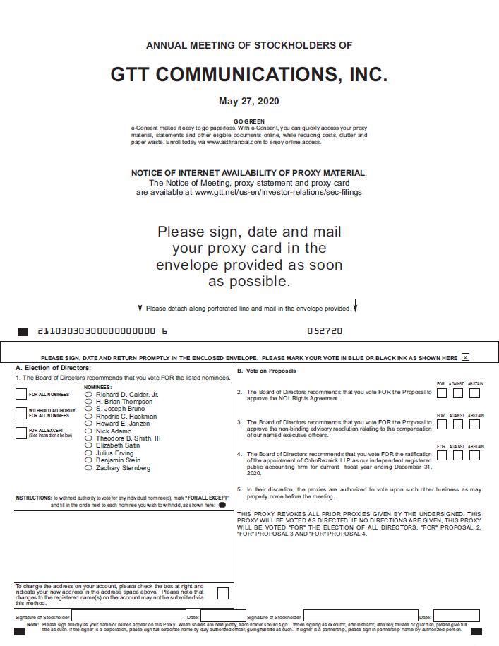 ANNUAL MEETING OF STOCKHOLDERS OF GTT COMMUNICATIONS, INC. May 27, 2020 GO GREEN e-Consent makes it easy to go paperless. With e-Consent, you can quickly access your proxy material, statements and other eligible documents online, while reducing costs, clutter and paper waste. Enroll today via www.astfinancial.com to enjoy online access. NOTICE OF INTERNET AVAILABILITY OF PROXY MATERIAL: The Notice of Meeting, proxy statement and proxy card are available at www.gtt.net/us-en/investor-relations/sec-filings Please sign, date and mail your proxy card in the envelope provided as soon as possible. Please detach along perforated line and mail in the envelope provided. 21103030300000000000 6 052720 PLEASE SIGN, DATE AND RETURN PROMPTLY IN THE ENCLOSED ENVELOPE. PLEASE MARK YOUR VOTE IN BLUE OR BLACK INK AS SHOWN HERE x A. Election of Directors: B. Vote on Proposals 1. The Board of Directors recommends that you vote FOR the listed nominees. FOR AGAINST ABSTAIN NOMINEES: 2. The Board of Directors recommends that you vote FOR the Proposal to FOR ALL NOMINEES O Richard D. Calder, Jr. O H. Brian Thompson approve the NOL Rights Agreement. WITHHOLD AUTHORITY O S. Joseph Bruno FOR ALL NOMINEES O Rhodric C. Hackman 3. The Board of Directors recommends that you vote FOR the Proposal to FOR AGAINST ABSTAIN O Howard E. Janzen FOR ALL EXCEPT O Nick Adamo approve the non-binding advisory resolution relating to the compensation (See instructions below) O Theodore B. Smith, III of our named executive officers. O Elizabeth Satin FOR AGAINST ABSTAIN O Julius Erving 4. The Board of Directors recommends that you vote FOR the ratification O Benjamin Stein of the appointment of CohnReznick LLP as our independent registered O Zachary Sternberg public accounting firm for current fiscal year ending December 31, 2020. 5. In their discretion, the proxies are authorized to vote upon such other business as may INSTRUCTIONS: To withhold authority to vote for any individual nominee(s), mark “FOR ALL EXCEPT” properly come before the meeting. and fill in the circle next to each nominee you wish to withhold, as shown here: THIS PROXY REVOKES ALL PRIOR PROXIES GIVEN BY THE UNDERSIGNED. THIS PROXY WILL BE VOTED AS DIRECTED. IF NO DIRECTIONS ARE GIVEN, THIS PROXY WILL BE VOTED "FOR" THE ELECTION OF ALL DIRECTORS, "FOR" PROPOSAL 2, "FOR" PROPOSAL 3 AND "FOR" PROPOSAL 4. To change the address on your account, please check the box at right and indicate your new address in the address space above. Please note that changes to the registered name(s) on the account may not be submitted via this method. Signature of Stockholder Date: Signature of Stockholder Date: Note: Please sign exactly as your name or names appear on this Proxy. When shares are held jointly, each holder should sign. When signing as executor, administrator, attorney, trustee or guardian, please give full title as such. If the signer is a corporation, please sign full corporate name by duly authorized officer, giving full title as such. If signer is a partnership, please sign in partnership name by authorized person.