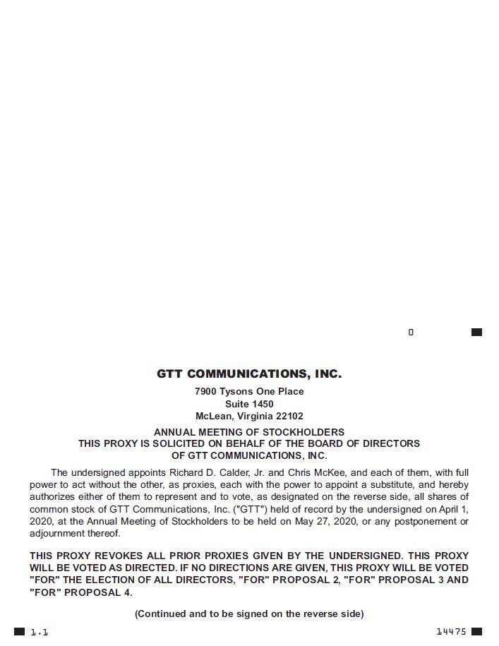 0 GTT COMMUNICATIONS, INC. 7900 Tysons One Place Suite 1450 McLean, Virginia 22102 ANNUAL MEETING OF STOCKHOLDERS THIS PROXY IS SOLICITED ON BEHALF OF THE BOARD OF DIRECTORS OF GTT COMMUNICATIONS, INC. The undersigned appoints Richard D. Calder, Jr. and Chris McKee, and each of them, with full power to act without the other, as proxies, each with the power to appoint a substitute, and hereby authorizes either of them to represent and to vote, as designated on the reverse side, all shares of common stock of GTT Communications, Inc. ("GTT") held of record by the undersigned on April 1, 2020, at the Annual Meeting of Stockholders to be held on May 27, 2020, or any postponement or adjournment thereof. THIS PROXY REVOKES ALL PRIOR PROXIES GIVEN BY THE UNDERSIGNED. THIS PROXY WILL BE VOTED AS DIRECTED. IF NO DIRECTIONS ARE GIVEN, THIS PROXY WILL BE VOTED "FOR" THE ELECTION OF ALL DIRECTORS, "FOR" PROPOSAL 2, "FOR" PROPOSAL 3 AND "FOR" PROPOSAL 4. (Continued and to be signed on the reverse side) 1.1 14475