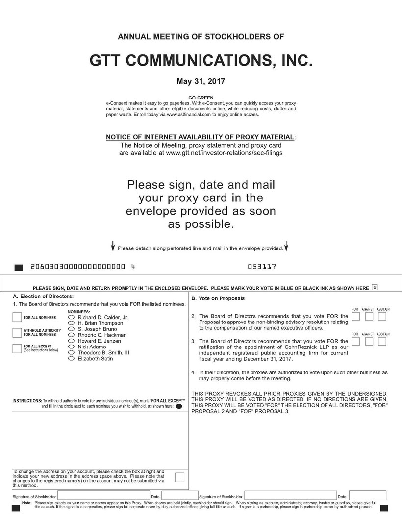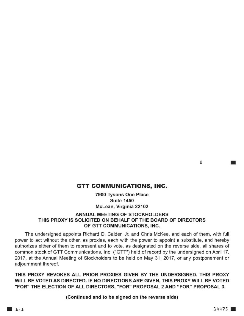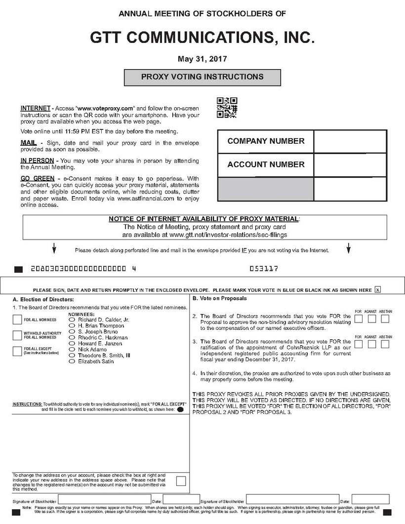You are cordially invited to attend the annual meeting of stockholders of GTT Communications, Inc. to be held at 10:00 a.m., local time, on, Wednesday, May 31, 2017, at our offices, 7900 Tysons One Place, Suite 1450, McLean, Virginia 22102.