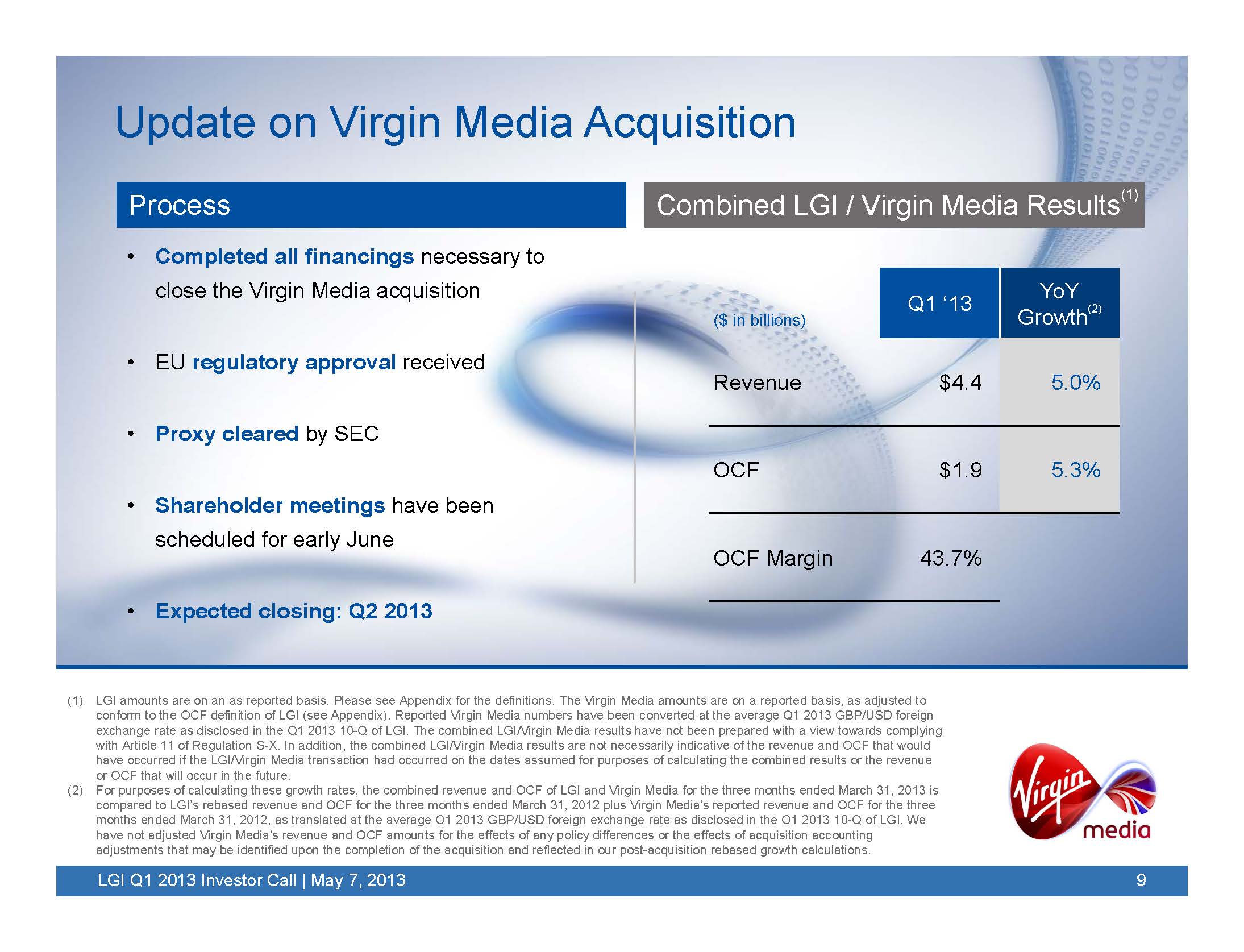 Nothing in this communication shall constitute a solicitation to buy or subscribe for or an offer to sell any securities of Liberty Global, Virgin Media or Liberty Global Corporation Limited (New Liberty Global). In connection with the proposed acquisition of Virgin Media by Liberty Global, Liberty Global and Virgin Media have filed with the Securities Exchange Commission (SEC) and mailed to their respective stockholders a joint proxy statement/prospectus, and New Liberty Global has filed a Registration Statement on Form S-4 with the SEC. STOCKHOLDERS OF EACH COMPANY AND OTHER INVESTORS ARE URGED TO READ THE REGISTRATION STATEMENT AND JOINT PROXY STATEMENT/PROSPECTUS (INCLUDING ANY AMENDMENTS OR SUPPLEMENTS THERETO) REGARDING THE PROPOSED TRANSACTION BECAUSE THEY CONTAIN IMPORTANT INFORMATION. Stockholders can obtain a free copy of the registration statement and joint proxy statement/prospectus, as well as other filings containing information about Liberty Global, Virgin Media and New Liberty Global, without charge, at the SEC's Internet site (http://www.sec.gov). Copies of the registration statement and joint proxy statement/prospectus and the filings with the SEC that are incorporated by reference therein can also be obtained, without charge, by directing a request to Liberty Global, Inc., 12300 Liberty Boulevard, Englewood, Colorado, 80112, USA, Attention: Investor Relations, Telephone: +1 303 220 6600, or to Virgin Media Limited, Communications House, Bartley Wood Business Park, Bartley Way, Hook, RG27 9UP, United Kingdom, Attn: Investor Relations Department, Telephone +44 (0) 1256 753037.