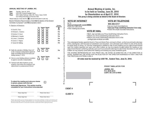 AnnUAL mEETing OF JAmBA, inc. Annual Meeting of Jamba, Inc. Date: Tuesday, June 26, 2018 to be held on Tuesday, June 26, 2018 Time: 9:00 A.M. (Central Daylight Time) Place: 3001 Dallas Parkway, Suite 140, Frisco, Texas 75034 for Shareholders as of April 27, 2018 See Voting Instruction on Reverse Side. This proxy is being solicited on behalf of the Board of Directors Please make your marks like this: Use dark black pencil or pen only Board of Directors Recommends a Vote FOR the election of the Director Please separate carefully at the per foration and return just this portion in the envelope provided. VOTE BY inTERnET VOTE BY TELEPHOnE nominees in proposal 1 and FOR proposals 2 and 3. Go To 866-284-5317 www.proxypush.com/JmBA 1: Election of Directors Directors • Use any touch-tone telephone. • Cast your vote online. Recommend For Against Abstain • Have your Proxy Card/Voting Instruction Form ready. • View meeting documents. 01 David A. Pace For • Follow the simple recorded instructions. VOTE BY mAiL 02 Richard L. Federico For 03 Andrew R. Heyer For 04 Michael A. Depatie For 05 Lorna C. Donatone For 06 James C. Pappas For 07 Glenn W. Welling For For Against Abstain 2: Ratify the selection of Whitley Penn LLP For as the Company’s independent registered public accounting firm for the fiscal year ending January 1, 2019. For Against Abstain 3: Vote on a non-binding advisory resolution For to approve executive compensation. 4: Transact such other business as may properly come before the meeting or any adjournment or postponement thereof. • Mark, sign and date your Proxy Card/Voting Instruction Form. • Detach your Proxy Card/Voting Instruction Form. • Return your Proxy Card/Voting Instruction Form in the postage-paid envelope provided. The undersigned hereby appoints David A. Pace and Marie Perry, and each of them, as the true and lawful attorneys of the undersigned, with full power of substitution and revocation, and authorizes each of them to vote all the shares of capital stock of Jamba, Inc. that the undersigned is entitled to vote at said meeting and any adjournment thereof upon the matters specified and upon such other matters as may be properly brought before the meeting or any adjournment thereof, conferring authority upon such true and lawful attorneys to vote in their discretion on such other matters as may properly come before the meeting and revoking any proxy heretofore given. THE SHARES REPRESENTED BY THIS PROXY WILL BE VOTED AS DIRECTED OR, IF NO DIRECTION IS GIVEN, SHARES WILL BE VOTED FOR THE ELECTION OF THE DIRECTOR NOMINEES IN ITEM 1 AND FOR THE PROPOSALS IN ITEMS 2 AND 3. All votes must be received by 5:00 P.M., Eastern Time, June 25, 2018. PROXY TABULATOR FOR JAmBA, inc. P.O. BOX 8016 cARY, nc 27512-9903 To attend the meeting and vote your shares in person, please mark this box. Authorized Signatures - This section must be completed for your instructions to be executed. EVENT # Please Sign Here Please Date Above CLIENT # Please Sign Here Please Date Above Please sign exactly as your name(s) appears on your stock certificate. If held in joint tenancy, all persons should sign. Trustees, administrators, etc., should include title and authority. Corporations should provide full name of corporation and title of authorized officer signing the proxy.