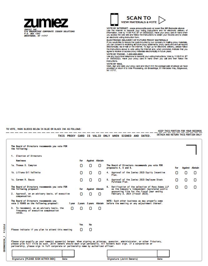 VOTE BY INTERNET - www.proxyvote.com Use the Internet to transmit your voting instructions and for electronic delivery of information. Vote by 11:59 P.M. ET on 06/01/2021. Have your proxy card in hand when you access the web site and follow the instructions to obtain your records and to create an electronic voting instruction form. ELECTRONIC DELIVERY OF FUTURE PROXY MATERIALS If you would like to reduce the costs incurred by our company in mailing proxy materials, you can consent to receiving all future proxy statements, proxy cards and annual reports electronically via e-mail or the Internet. To sign up for electronic delivery, please follow the instructions above to vote using the Internet and, when prompted, indicate that you agree to receive or access proxy materials electronically in future years. VOTE BY PHONE - 1-800-690-6903 Use any touch-tone telephone to transmit your voting instructions. Vote by 11:59 P.M. ET on 06/01/2021. Have your proxy card in hand when you call and then follow the instructions. VOTE BY MAIL Mark, sign and date your proxy card and return it in the postage-paid envelope we have provided or return it to Vote Processing, c/o Broadridge, 51 Mercedes Way, Edgewood, NY 11717. The Board of Directors recommends you vote FOR the following: 1. Election of Directors Nominees For Against Abstain 1a. Richard M. Brooks 1b. Steve P. Louden 1c. James P. Murphy The Board of Directors recommends you vote FOR proposal 2: For Against Abstain 2. Ratification of the selection of Moss Adams LLP as the Company's independent registered public accounting firm for the fiscal year ending January 29, 2022 (fiscal 2021). NOTE: Such other business as may properly come before the meeting or any adjournment thereof. Please sign exactly as your name(s) appear(s) hereon. When signing as attorney, executor, administrator, or other fiduciary, please give full title as such. Joint owners should each sign personally. All holders must sign. If a corporation or partnership, please sign in full corporate or partnership name by authorized officer. Yes No Please indicate if you plan to attend this meeting Signature [PLEASE SIGN WITHIN BOX] Date Signature (Joint Owners) Date 0000505391_1 R1.0.0.177 THIS PROXY CARD IS VALID ONLY WHEN SIGNED AND DATED. KEEP THIS PORTION FOR YOUR RECORDS DETACH AND RETURN THIS PORTION ONLY TO VOTE, MARK BLOCKS BELOW IN BLUE OR BLACK INK AS FOLLOWS: ZUMIEZ INC. C/O BROADRIDGE P.O. BOX 1342 BRENTWOOD, NY 11717