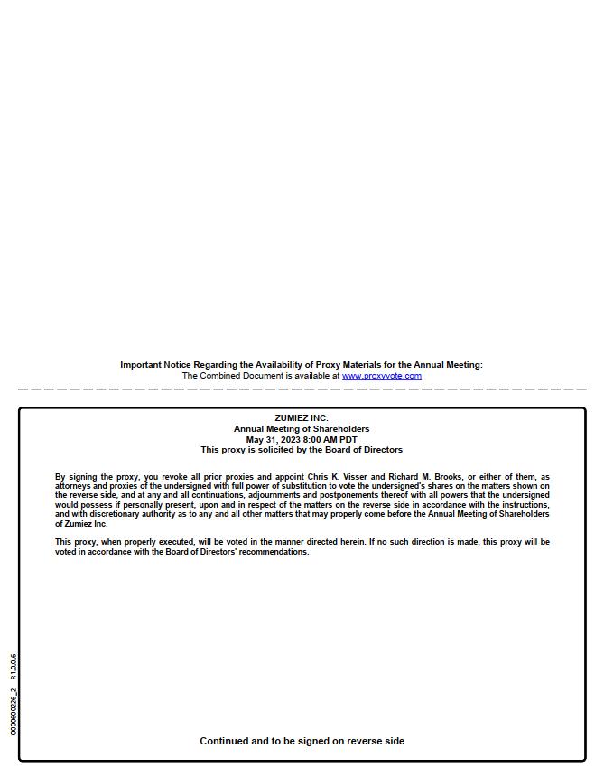 IMPORTANT NOTICE REGARDING THE AVAILABILITY OF PROXY MATERIALS FOR THE ANNUAL MEETING OF SHAREHOLDERS TO BE HELD ON MAY 31, 2023: The Notice of Annual Meeting of Shareholders, Proxy Statement and the Annual Report to Shareholders are available on the internet at https://ir.zumiez.com/financial-information/annual-reports.