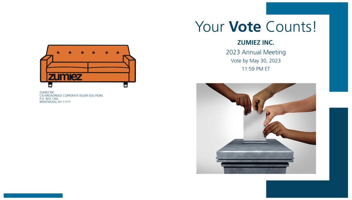 BARCODE 1 OF 2 12 15 1234567 1234567 1234567 1234567 1234567 1234567 1234567 See the reverse side of this notice to obtain proxy materials and voting instructions. Broadridge Internal Use Only Job # Envelope # Sequence # # of # Sequence # *** Exercise Your Right to Vote *** Important use this notice to vote these shares. This communication presents only an overview of the more complete proxy materials that are available to you on the Internet. You may view the proxy materials online at www.proxyvote.com or easily request a paper copy (see reverse side). We encourage you to access and review all of the important information contained in the proxy materials before voting. Meeting Information Meeting Type: For holders as of: Date: Time: Location: 0000438182_1 R1.0.1.18 ZUMIEZ INC. Zumiez Distribution Center 1346 Railroad Street Corona, CA 92882 Investor Address Line 1 Investor Address Line 2 Investor Address Line 3 Investor Address Line 4 Investor Address Line 5 John Sample 1234 ANYWHERE STREET ANY CITY, ON A1A 1A1 Annual Meeting March 25, 2020 June 03, 2020 June 03, 2020 9:00 AM PDT