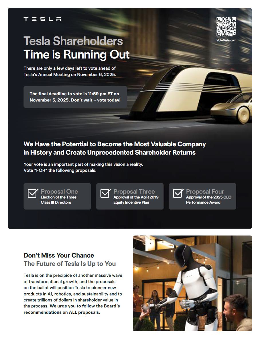 Tesla has filed with the U.S. Securities and Exchange Commission (the ”SEC”) a definitive proxy statement on Schedule 14A (the “Definitive Proxy Statement”) and a proxy card with respect to its solicitation of proxies for Tesla’s 2025 Annual Meeting of Shareholders (the “2025 Annual Meeting”). The Definitive Proxy Statement contains important information about the matters to be voted on at the 2025 Annual Meeting. SHAREHOLDERS OF TESLA ARE URGED TO READ THESE MATERIALS (INCLUDING ANY AMENDMENTS OR SUPPLEMENTS THERETO) AND ANY OTHER RELEVANT DOCUMENTS THAT TESLA HAS FILED OR WILL FILE WITH THE SEC BECAUSE THEY CONTAIN OR WILL CONTAIN IMPORTANT INFORMATION ABOUT TESLA AND THE MATTERS TO BE VOTED ON AT THE 2025 ANNUAL MEETING. Shareholders are able to obtain free copies of these documents, and other documents filed with the SEC by Tesla, through the website maintained by the SEC at www.sec.gov. In addition, shareholders are able to obtain free copies of these documents from Tesla by contacting Tesla’s Investor Relations by e-mail at ir@tesla.com, or by going to Tesla’s Investor Relations page on its website at ir.tesla.com.