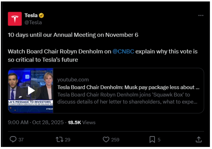 Denholm and other Tesla board members are meeting this week with the company’s largest institutional investors which include Vanguard, BlackRock and State Street, to lobby for the plan ahead of a vote on November 6.