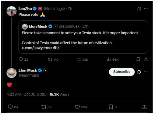 On October 30, 2025, Tesla, Inc. (“Tesla”), Elon Musk, Tom Zhu, Ashok Elluswamy and Tesla Optimus posted on X, copies of which are attached hereto as Exhibit 1. Also on October 30 2025, Tesla updated its website, www.VoteTesla.com. A copy of the updated material is attached hereto as Exhibit 2.