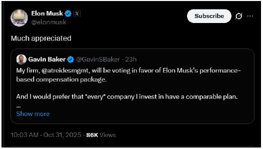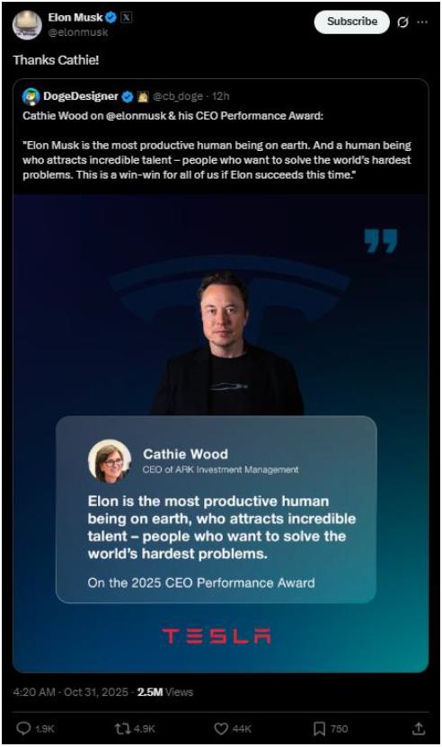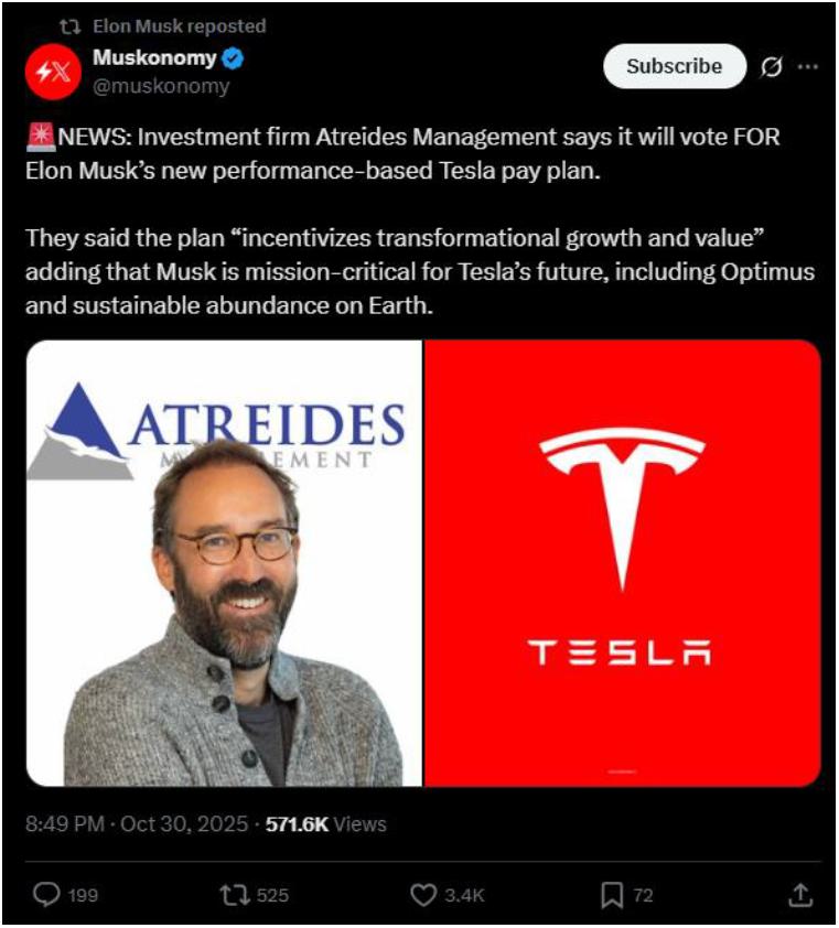 On October 31, 2025, Tesla, Inc. (“Tesla”) sent a communication to its employees, a copy of which is attached hereto as Exhibit 1. In addition, on October 31, 2025, Elon Musk posted on X, copies of which are attached hereto as Exhibit 2. Also on October 31, 2025, Tesla updated its website, www.VoteTesla.com. A copy of the updated material is attached hereto as Exhibit 3.
