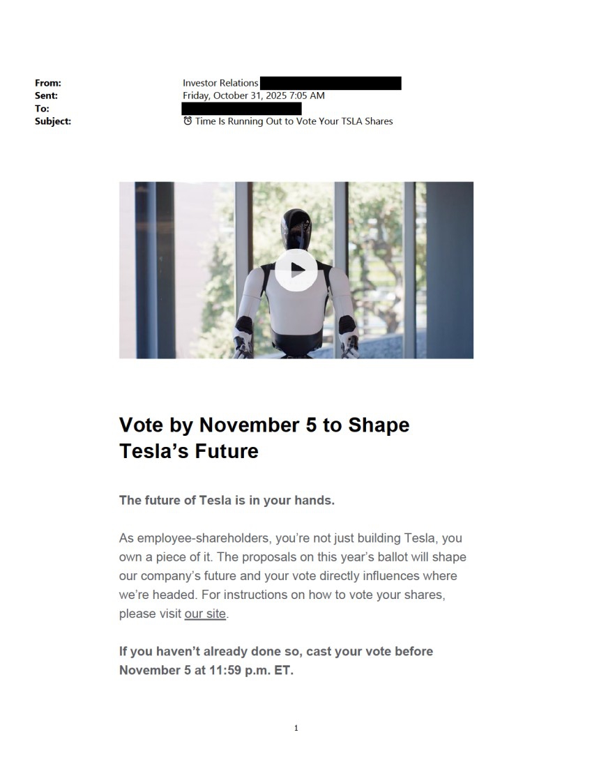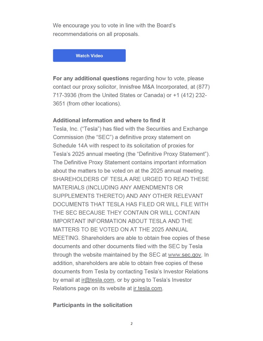 Tesla has filed with the U.S. Securities and Exchange Commission (the ”SEC”) a definitive proxy statement on Schedule 14A (the “Definitive Proxy Statement”) and a proxy card with respect to its solicitation of proxies for Tesla’s 2025 Annual Meeting of Shareholders (the “2025 Annual Meeting”). The Definitive Proxy Statement contains important information about the matters to be voted on at the 2025 Annual Meeting. SHAREHOLDERS OF TESLA ARE URGED TO READ THESE MATERIALS (INCLUDING ANY AMENDMENTS OR SUPPLEMENTS THERETO) AND ANY OTHER RELEVANT DOCUMENTS THAT TESLA HAS FILED OR WILL FILE WITH THE SEC BECAUSE THEY CONTAIN OR WILL CONTAIN IMPORTANT INFORMATION ABOUT TESLA AND THE MATTERS TO BE VOTED ON AT THE 2025 ANNUAL MEETING. Shareholders are able to obtain free copies of these documents, and other documents filed with the SEC by Tesla, through the website maintained by the SEC at www.sec.gov. In addition, shareholders are able to obtain free copies of these documents from Tesla by contacting Tesla’s Investor Relations by e-mail at ir@tesla.com, or by going to Tesla’s Investor Relations page on its website at ir.tesla.com.