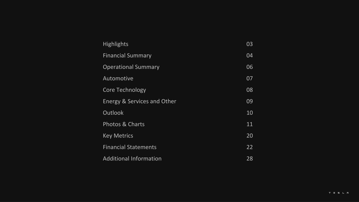 Highlights 03 Financial Summary 04 Operational Summary 06 Automotive 07 Core Technology 08 Energy & Services and Other 09 Outlook 10 Photos & Charts 11 Key Metrics 20 Financial Statements 22 Additional Information 28 2