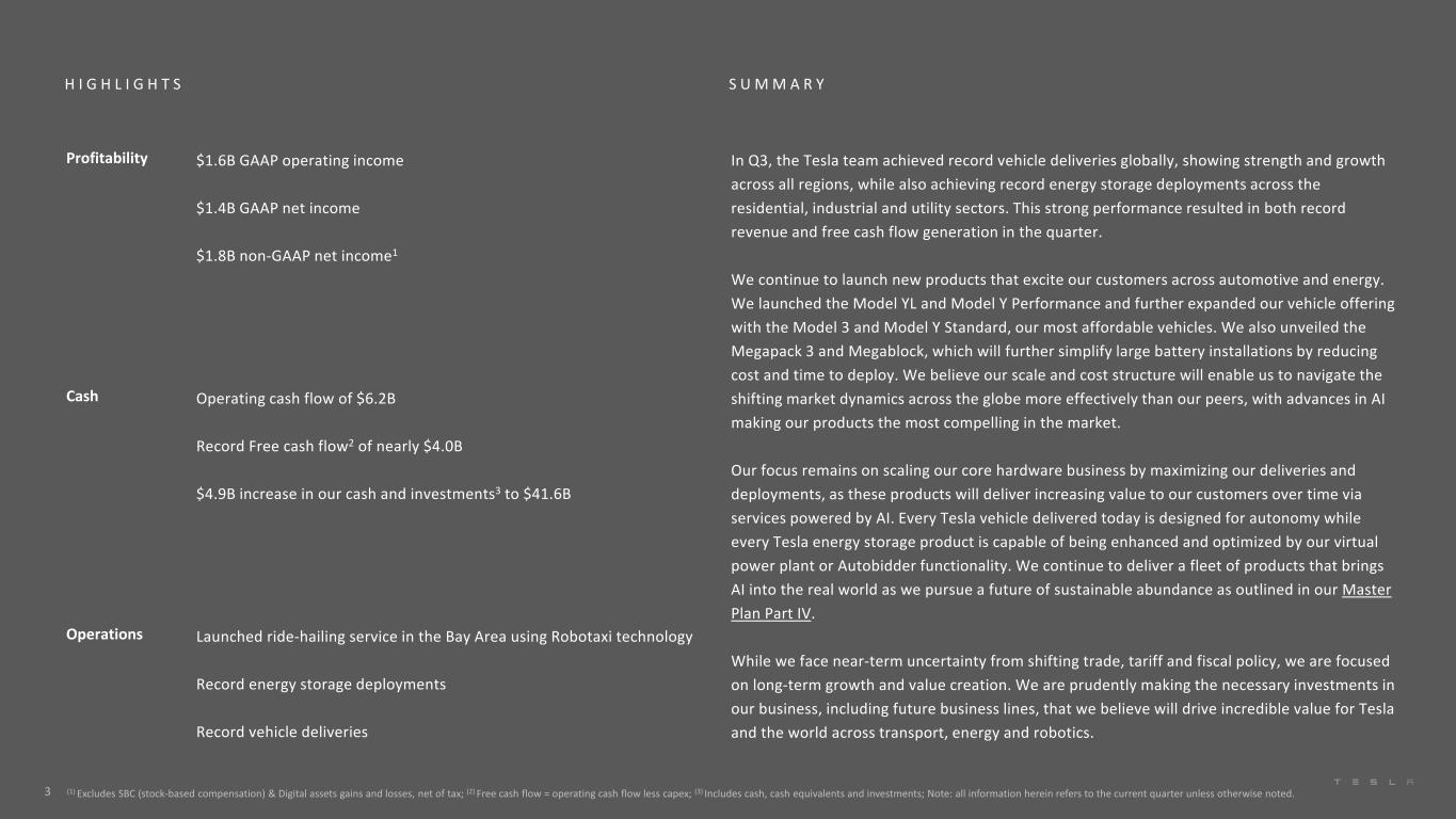 S U M M A R YH I G H L I G H T S (1) Excludes SBC (stock-based compensation) & Digital assets gains and losses, net of tax; (2) Free cash flow = operating cash flow less capex; (3) Includes cash, cash equivalents and investments; Note: all information herein refers to the current quarter unless otherwise noted. Profitability $1.6B GAAP operating income $1.4B GAAP net income $1.8B non-GAAP net income1 In Q3, the Tesla team achieved record vehicle deliveries globally, showing strength and growth across all regions, while also achieving record energy storage deployments across the residential, industrial and utility sectors. This strong performance resulted in both record revenue and free cash flow generation in the quarter. We continue to launch new products that excite our customers across automotive and energy. We launched the Model YL and Model Y Performance and further expanded our vehicle offering with the Model 3 and Model Y Standard, our most affordable vehicles. We also unveiled the Megapack 3 and Megablock, which will further simplify large battery installations by reducing cost and time to deploy. We believe our scale and cost structure will enable us to navigate the shifting market dynamics across the globe more effectively than our peers, with advances in AI making our products the most compelling in the market. Our focus remains on scaling our core hardware business by maximizing our deliveries and deployments, as these products will deliver increasing value to our customers over time via services powered by AI. Every Tesla vehicle delivered today is designed for autonomy while every Tesla energy storage product is capable of being enhanced and optimized by our virtual power plant or Autobidder functionality. We continue to deliver a fleet of products that brings AI into the real world as we pursue a future of sustainable abundance as outlined in our Master Plan Part IV. While we face near-term uncertainty from shifting trade, tariff and fiscal policy, we are focused on long-term growth and value creation. We are prudently making the necessary investments in our business, including future business lines, that we believe will drive incredible value for Tesla and the world across transport, energy and robotics. Cash Operating cash flow of $6.2B Record Free cash flow2 of nearly $4.0B $4.9B increase in our cash and investments3 to $41.6B Operations Launched ride-hailing service in the Bay Area using Robotaxi technology Record energy storage deployments Record vehicle deliveries 3