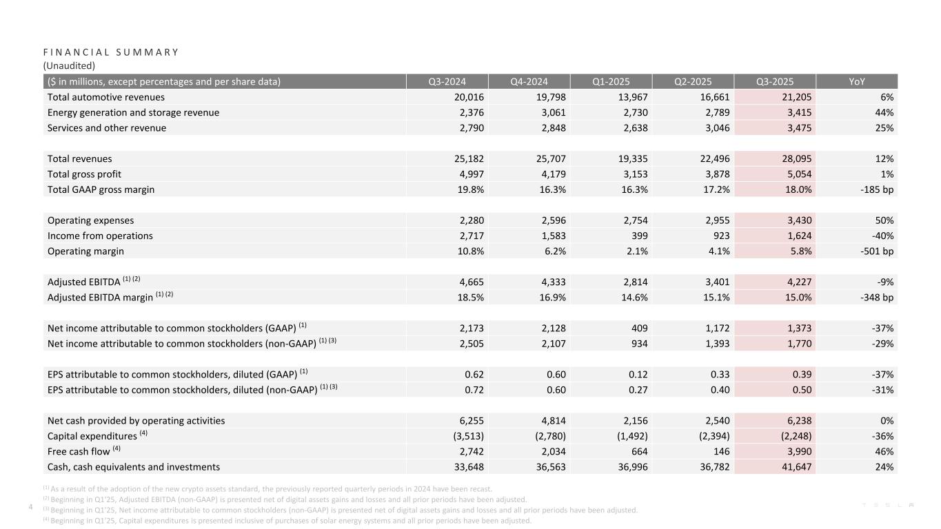 F I N A N C I A L S U M M A R Y (Unaudited) ($ in millions, except percentages and per share data) Q3-2024 Q4-2024 Q1-2025 Q2-2025 Q3-2025 YoY Total automotive revenues 20,016 19,798 13,967 16,661 21,205 6% Energy generation and storage revenue 2,376 3,061 2,730 2,789 3,415 44% Services and other revenue 2,790 2,848 2,638 3,046 3,475 25% Total revenues 25,182 25,707 19,335 22,496 28,095 12% Total gross profit 4,997 4,179 3,153 3,878 5,054 1% Total GAAP gross margin 19.8% 16.3% 16.3% 17.2% 18.0% -185 bp Operating expenses 2,280 2,596 2,754 2,955 3,430 50% Income from operations 2,717 1,583 399 923 1,624 -40% Operating margin 10.8% 6.2% 2.1% 4.1% 5.8% -501 bp Adjusted EBITDA (1) (2) 4,665 4,333 2,814 3,401 4,227 -9% Adjusted EBITDA margin (1) (2) 18.5% 16.9% 14.6% 15.1% 15.0% -348 bp Net income attributable to common stockholders (GAAP) (1) 2,173 2,128 409 1,172 1,373 -37% Net income attributable to common stockholders (non-GAAP) (1) (3) 2,505 2,107 934 1,393 1,770 -29% EPS attributable to common stockholders, diluted (GAAP) (1) 0.62 0.60 0.12 0.33 0.39 -37% EPS attributable to common stockholders, diluted (non-GAAP) (1) (3) 0.72 0.60 0.27 0.40 0.50 -31% Net cash provided by operating activities 6,255 4,814 2,156 2,540 6,238 0% Capital expenditures (4) (3,513) (2,780) (1,492) (2,394) (2,248) -36% Free cash flow (4) 2,742 2,034 664 146 3,990 46% Cash, cash equivalents and investments 33,648 36,563 36,996 36,782 41,647 24% 4 (1) As a result of the adoption of the new crypto assets standard, the previously reported quarterly periods in 2024 have been recast. (2) Beginning in Q1'25, Adjusted EBITDA (non-GAAP) is presented net of digital assets gains and losses and all prior periods have been adjusted. (3) Beginning in Q1'25, Net income attributable to common stockholders (non-GAAP) is presented net of digital assets gains and losses and all prior periods have been adjusted. (4) Beginning in Q1'25, Capital expenditures is presented inclusive of purchases of solar energy systems and all prior periods have been adjusted.