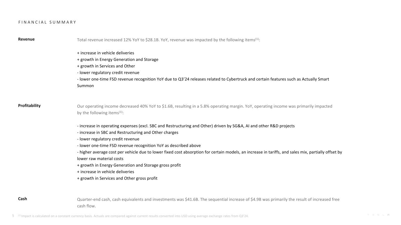 F I N A N C I A L S U M M A R Y Revenue Total revenue increased 12% YoY to $28.1B. YoY, revenue was impacted by the following items(1): + increase in vehicle deliveries + growth in Energy Generation and Storage + growth in Services and Other - lower regulatory credit revenue - lower one-time FSD revenue recognition YoY due to Q3’24 releases related to Cybertruck and certain features such as Actually Smart Summon Profitability Our operating income decreased 40% YoY to $1.6B, resulting in a 5.8% operating margin. YoY, operating income was primarily impacted by the following items(1): - increase in operating expenses (excl. SBC and Restructuring and Other) driven by SG&A, AI and other R&D projects - increase in SBC and Restructuring and Other charges - lower regulatory credit revenue - lower one-time FSD revenue recognition YoY as described above - higher average cost per vehicle due to lower fixed cost absorption for certain models, an increase in tariffs, and sales mix, partially offset by lower raw material costs + growth in Energy Generation and Storage gross profit + increase in vehicle deliveries + growth in Services and Other gross profit Cash Quarter-end cash, cash equivalents and investments was $41.6B. The sequential increase of $4.9B was primarily the result of increased free cash flow. 5 (1) Impact is calculated on a constant currency basis. Actuals are compared against current results converted into USD using average exchange rates from Q3’24.