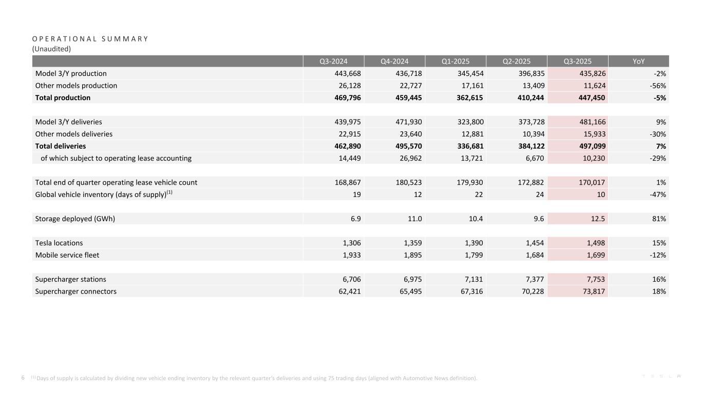 Q3-2024 Q4-2024 Q1-2025 Q2-2025 Q3-2025 YoY Model 3/Y production 443,668 436,718 345,454 396,835 435,826 -2% Other models production 26,128 22,727 17,161 13,409 11,624 -56% Total production 469,796 459,445 362,615 410,244 447,450 -5% Model 3/Y deliveries 439,975 471,930 323,800 373,728 481,166 9% Other models deliveries 22,915 23,640 12,881 10,394 15,933 -30% Total deliveries 462,890 495,570 336,681 384,122 497,099 7% of which subject to operating lease accounting 14,449 26,962 13,721 6,670 10,230 -29% Total end of quarter operating lease vehicle count 168,867 180,523 179,930 172,882 170,017 1% Global vehicle inventory (days of supply)(1) 19 12 22 24 10 -47% Storage deployed (GWh) 6.9 11.0 10.4 9.6 12.5 81% Tesla locations 1,306 1,359 1,390 1,454 1,498 15% Mobile service fleet 1,933 1,895 1,799 1,684 1,699 -12% Supercharger stations 6,706 6,975 7,131 7,377 7,753 16% Supercharger connectors 62,421 65,495 67,316 70,228 73,817 18% (1) Days of supply is calculated by dividing new vehicle ending inventory by the relevant quarter’s deliveries and using 75 trading days (aligned with Automotive News definition). O P E R A T I O N A L S U M M A R Y (Unaudited) 6