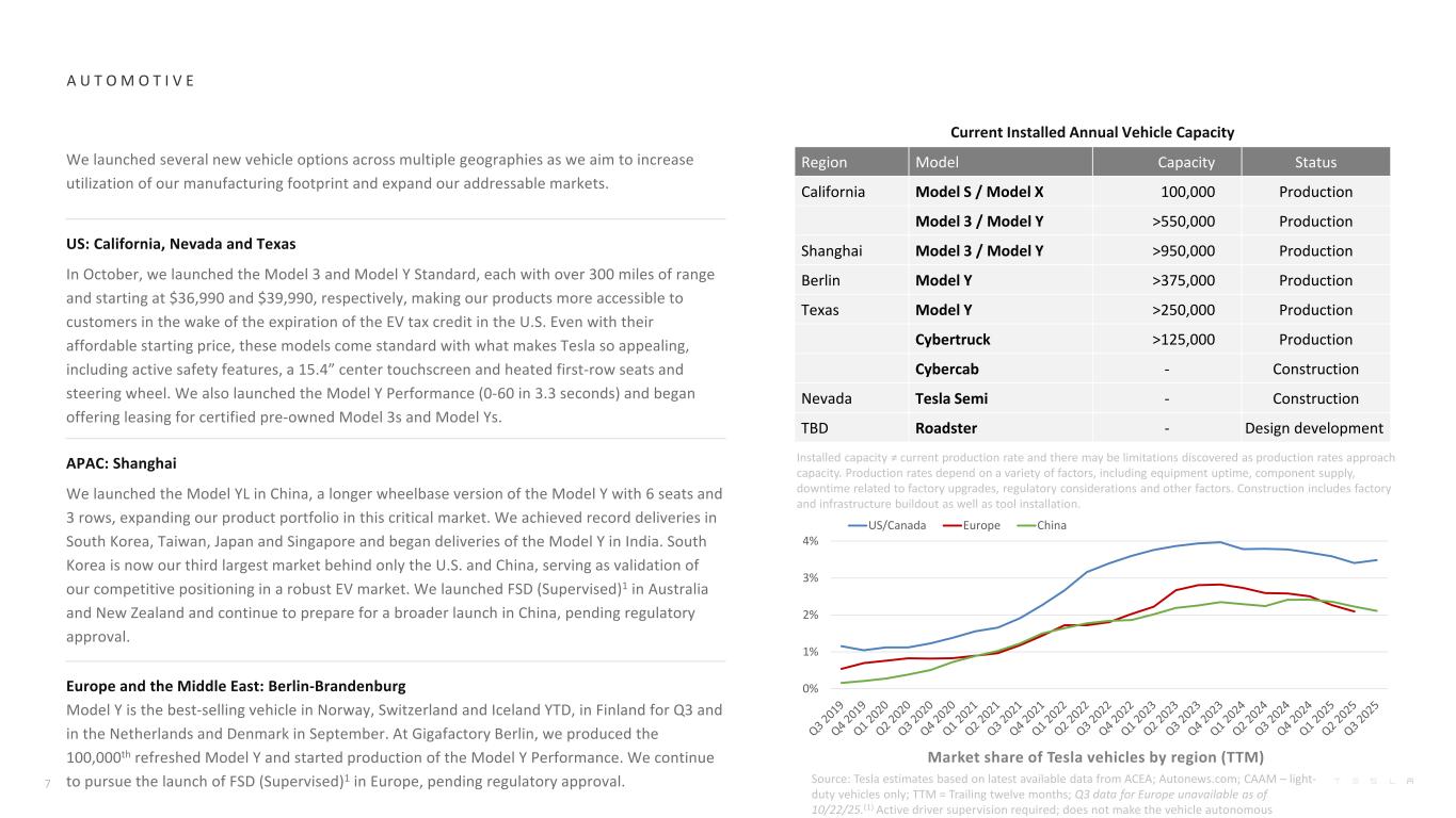 A U T O M O T I V E Current Installed Annual Vehicle Capacity Region Model Capacity Status California Model S / Model X 100,000 Production Model 3 / Model Y >550,000 Production Shanghai Model 3 / Model Y >950,000 Production Berlin Model Y >375,000 Production Texas Model Y >250,000 Production Cybertruck >125,000 Production Cybercab - Construction Nevada Tesla Semi - Construction TBD Roadster - Design development Installed capacity ≠ current production rate and there may be limitations discovered as production rates approach capacity. Production rates depend on a variety of factors, including equipment uptime, component supply, downtime related to factory upgrades, regulatory considerations and other factors. Construction includes factory and infrastructure buildout as well as tool installation. Market share of Tesla vehicles by region (TTM) Source: Tesla estimates based on latest available data from ACEA; Autonews.com; CAAM – light- duty vehicles only; TTM = Trailing twelve months; Q3 data for Europe unavailable as of 10/22/25.(1) Active driver supervision required; does not make the vehicle autonomous We launched several new vehicle options across multiple geographies as we aim to increase utilization of our manufacturing footprint and expand our addressable markets. US: California, Nevada and Texas In October, we launched the Model 3 and Model Y Standard, each with over 300 miles of range and starting at $36,990 and $39,990, respectively, making our products more accessible to customers in the wake of the expiration of the EV tax credit in the U.S. Even with their affordable starting price, these models come standard with what makes Tesla so appealing, including active safety features, a 15.4” center touchscreen and heated first-row seats and steering wheel. We also launched the Model Y Performance (0-60 in 3.3 seconds) and began offering leasing for certified pre-owned Model 3s and Model Ys. APAC: Shanghai We launched the Model YL in China, a longer wheelbase version of the Model Y with 6 seats and 3 rows, expanding our product portfolio in this critical market. We achieved record deliveries in South Korea, Taiwan, Japan and Singapore and began deliveries of the Model Y in India. South Korea is now our third largest market behind only the U.S. and China, serving as validation of our competitive positioning in a robust EV market. We launched FSD (Supervised)1 in Australia and New Zealand and continue to prepare for a broader launch in China, pending regulatory approval. Europe and the Middle East: Berlin-Brandenburg Model Y is the best-selling vehicle in Norway, Switzerland and Iceland YTD, in Finland for Q3 and in the Netherlands and Denmark in September. At Gigafactory Berlin, we produced the 100,000th refreshed Model Y and started production of the Model Y Performance. We continue to pursue the launch of FSD (Supervised)1 in Europe, pending regulatory approval.7 0% 1% 2% 3% 4% US/Canada Europe China