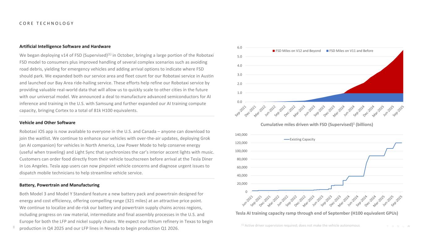 Tesla AI training capacity ramp through end of September (H100 equivalent GPUs) C O R E T E C H N O L O G Y Cumulative miles driven with FSD (Supervised)1 (billions) Artificial Intelligence Software and Hardware We began deploying v14 of FSD (Supervised)(1) in October, bringing a large portion of the Robotaxi FSD model to consumers plus improved handling of several complex scenarios such as avoiding road debris, yielding for emergency vehicles and adding arrival options to indicate where FSD should park. We expanded both our service area and fleet count for our Robotaxi service in Austin and launched our Bay Area ride-hailing service. These efforts help refine our Robotaxi service by providing valuable real-world data that will allow us to quickly scale to other cities in the future with our universal model. We announced a deal to manufacture advanced semiconductors for AI inference and training in the U.S. with Samsung and further expanded our AI training compute capacity, bringing Cortex to a total of 81k H100 equivalents. Vehicle and Other Software Robotaxi iOS app is now available to everyone in the U.S. and Canada – anyone can download to join the waitlist. We continue to enhance our vehicles with over-the-air updates, deploying Grok (an AI companion) for vehicles in North America, Low Power Mode to help conserve energy (useful when traveling) and Light Sync that synchronizes the car’s interior accent lights with music. Customers can order food directly from their vehicle touchscreen before arrival at the Tesla Diner in Los Angeles. Tesla app users can now pinpoint vehicle concerns and diagnose urgent issues to dispatch mobile technicians to help streamline vehicle service. Battery, Powertrain and Manufacturing Both Model 3 and Model Y Standard feature a new battery pack and powertrain designed for energy and cost efficiency, offering compelling range (321 miles) at an attractive price point. We continue to localize and de-risk our battery and powertrain supply chains across regions, including progress on raw material, intermediate and final assembly processes in the U.S. and Europe for both the LFP and nickel supply chains. We expect our lithium refinery in Texas to begin production in Q4 2025 and our LFP lines in Nevada to begin production Q1 2026.8 (1) Active driver supervision required; does not make the vehicle autonomous 0 20,000 40,000 60,000 80,000 100,000 120,000 140,000 Existing Capacity 0.0 1.0 2.0 3.0 4.0 5.0 6.0 FSD Miles on V12 and Beyond FSD Miles on V11 and Before