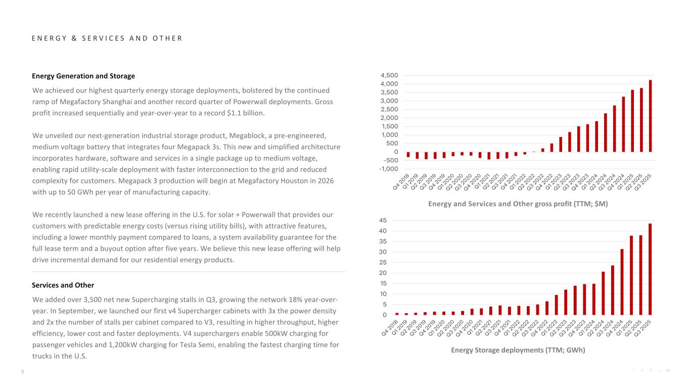 E N E R G Y & S E R V I C E S A N D O T H E R Energy Storage deployments (TTM; GWh) Energy and Services and Other gross profit (TTM; $M) Energy Generation and Storage We achieved our highest quarterly energy storage deployments, bolstered by the continued ramp of Megafactory Shanghai and another record quarter of Powerwall deployments. Gross profit increased sequentially and year-over-year to a record $1.1 billion. We unveiled our next-generation industrial storage product, Megablock, a pre-engineered, medium voltage battery that integrates four Megapack 3s. This new and simplified architecture incorporates hardware, software and services in a single package up to medium voltage, enabling rapid utility-scale deployment with faster interconnection to the grid and reduced complexity for customers. Megapack 3 production will begin at Megafactory Houston in 2026 with up to 50 GWh per year of manufacturing capacity. We recently launched a new lease offering in the U.S. for solar + Powerwall that provides our customers with predictable energy costs (versus rising utility bills), with attractive features, including a lower monthly payment compared to loans, a system availability guarantee for the full lease term and a buyout option after five years. We believe this new lease offering will help drive incremental demand for our residential energy products. Services and Other We added over 3,500 net new Supercharging stalls in Q3, growing the network 18% year-over- year. In September, we launched our first v4 Supercharger cabinets with 3x the power density and 2x the number of stalls per cabinet compared to V3, resulting in higher throughput, higher efficiency, lower cost and faster deployments. V4 superchargers enable 500kW charging for passenger vehicles and 1,200kW charging for Tesla Semi, enabling the fastest charging time for trucks in the U.S. 9 0 5 10 15 20 25 30 35 40 45 -1,000 -500 0 500 1,000 1,500 2,000 2,500 3,000 3,500 4,000 4,500