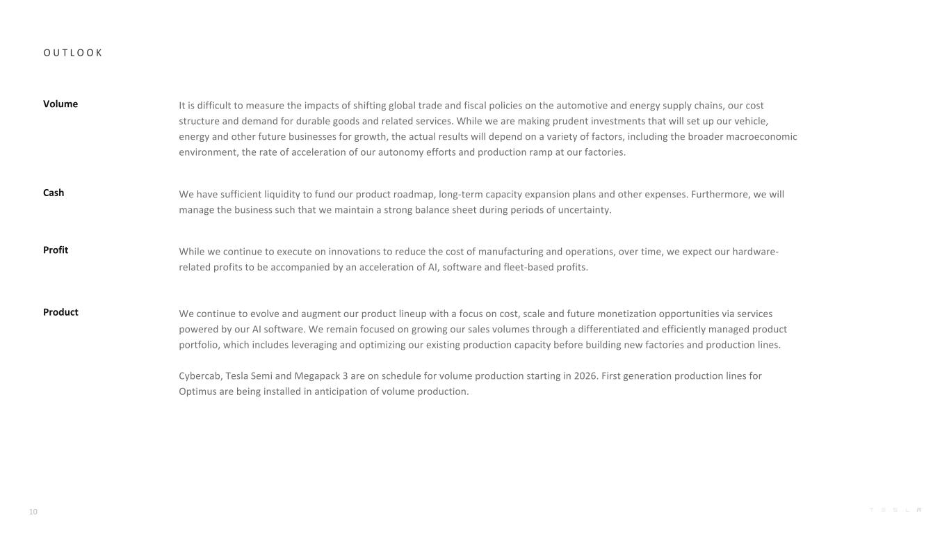 O U T L O O K Volume It is difficult to measure the impacts of shifting global trade and fiscal policies on the automotive and energy supply chains, our cost structure and demand for durable goods and related services. While we are making prudent investments that will set up our vehicle, energy and other future businesses for growth, the actual results will depend on a variety of factors, including the broader macroeconomic environment, the rate of acceleration of our autonomy efforts and production ramp at our factories. Cash We have sufficient liquidity to fund our product roadmap, long-term capacity expansion plans and other expenses. Furthermore, we will manage the business such that we maintain a strong balance sheet during periods of uncertainty. Profit While we continue to execute on innovations to reduce the cost of manufacturing and operations, over time, we expect our hardware- related profits to be accompanied by an acceleration of AI, software and fleet-based profits. Product We continue to evolve and augment our product lineup with a focus on cost, scale and future monetization opportunities via services powered by our AI software. We remain focused on growing our sales volumes through a differentiated and efficiently managed product portfolio, which includes leveraging and optimizing our existing production capacity before building new factories and production lines. Cybercab, Tesla Semi and Megapack 3 are on schedule for volume production starting in 2026. First generation production lines for Optimus are being installed in anticipation of volume production. 10