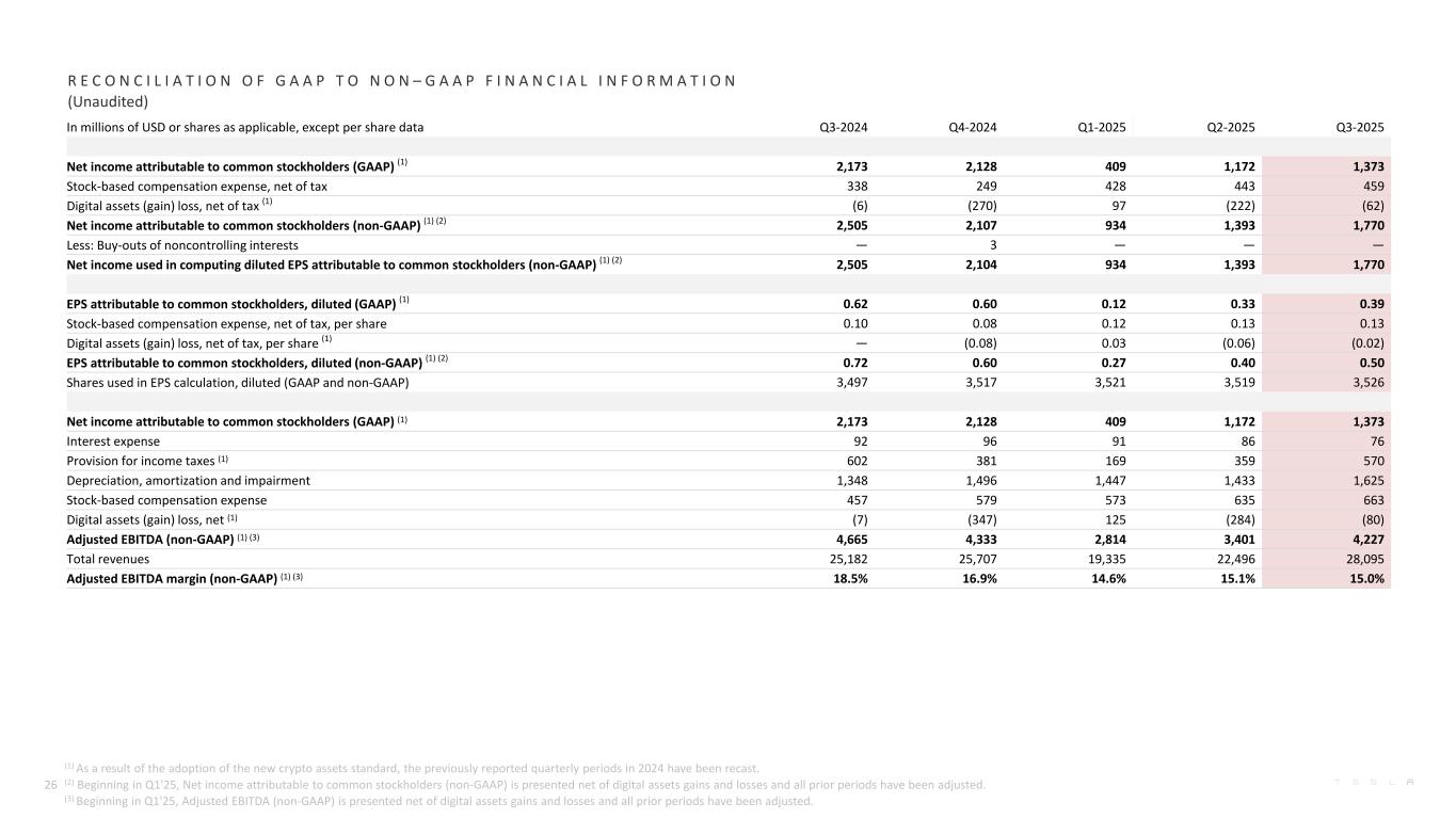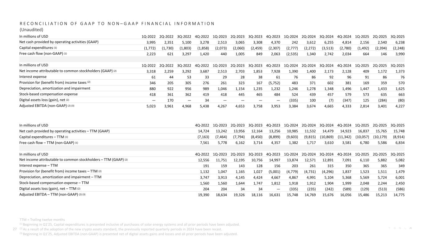 R E C O N C I L I A T I O N O F G A A P T O N O N – G A A P F I N A N C I A L I N F O R M A T I O N (Unaudited) In millions of USD 4Q-2022 1Q-2023 2Q-2023 3Q-2023 4Q-2023 1Q-2024 2Q-2024 3Q-2024 4Q-2024 1Q-2025 2Q-2025 3Q-2025 Net cash provided by operating activities – TTM (GAAP) 14,724 13,242 13,956 12,164 13,256 10,985 11,532 14,479 14,923 16,837 15,765 15,748 Capital expenditures – TTM (1) (7,163) (7,464) (7,794) (8,450) (8,899) (9,603) (9,815) (10,869) (11,342) (10,057) (10,179) (8,914) Free cash flow – TTM (non-GAAP) (1) 7,561 5,778 6,162 3,714 4,357 1,382 1,717 3,610 3,581 6,780 5,586 6,834 In millions of USD 4Q-2022 1Q-2023 2Q-2023 3Q-2023 4Q-2023 1Q-2024 2Q-2024 3Q-2024 4Q-2024 1Q-2025 2Q-2025 3Q-2025 Net income attributable to common stockholders – TTM (GAAP) (2) 12,556 11,751 12,195 10,756 14,997 13,874 12,571 12,891 7,091 6,110 5,882 5,082 Interest expense – TTM 191 159 143 128 156 203 261 315 350 365 365 349 Provision for (benefit from) income taxes – TTM (2) 1,132 1,047 1,165 1,027 (5,001) (4,779) (4,731) (4,296) 1,837 1,523 1,511 1,479 Depreciation, amortization and impairment – TTM 3,747 3,913 4,145 4,424 4,667 4,867 4,991 5,104 5,368 5,569 5,724 6,001 Stock-based compensation expense – TTM 1,560 1,560 1,644 1,747 1,812 1,918 1,912 1,904 1,999 2,048 2,244 2,450 Digital assets loss (gain), net – TTM (2) 204 204 34 34 — (335) (235) (242) (589) (129) (513) (586) Adjusted EBITDA – TTM (non-GAAP) (2) (3) 19,390 18,634 19,326 18,116 16,631 15,748 14,769 15,676 16,056 15,486 15,213 14,775 In millions of USD 1Q-2022 2Q-2022 3Q-2022 4Q-2022 1Q-2023 2Q-2023 3Q-2023 4Q-2023 1Q-2024 2Q-2024 3Q-2024 4Q-2024 1Q-2025 2Q-2025 3Q-2025 Net cash provided by operating activities (GAAP) 3,995 2,351 5,100 3,278 2,513 3,065 3,308 4,370 242 3,612 6,255 4,814 2,156 2,540 6,238 Capital expenditures (1) (1,772) (1,730) (1,803) (1,858) (2,073) (2,060) (2,459) (2,307) (2,777) (2,272) (3,513) (2,780) (1,492) (2,394) (2,248) Free cash flow (non-GAAP) (1) 2,223 621 3,297 1,420 440 1,005 849 2,063 (2,535) 1,340 2,742 2,034 664 146 3,990 In millions of USD 1Q-2022 2Q-2022 3Q-2022 4Q-2022 1Q-2023 2Q-2023 3Q-2023 4Q-2023 1Q-2024 2Q-2024 3Q-2024 4Q-2024 1Q-2025 2Q-2025 3Q-2025 Net income attributable to common stockholders (GAAP) (2) 3,318 2,259 3,292 3,687 2,513 2,703 1,853 7,928 1,390 1,400 2,173 2,128 409 1,172 1,373 Interest expense 61 44 53 33 29 28 38 61 76 86 92 96 91 86 76 Provision for (benefit from) income taxes (2) 346 205 305 276 261 323 167 (5,752) 483 371 602 381 169 359 570 Depreciation, amortization and impairment 880 922 956 989 1,046 1,154 1,235 1,232 1,246 1,278 1,348 1,496 1,447 1,433 1,625 Stock-based compensation expense 418 361 362 419 418 445 465 484 524 439 457 579 573 635 663 Digital assets loss (gain), net (2) — 170 — 34 — — — — (335) 100 (7) (347) 125 (284) (80) Adjusted EBITDA (non-GAAP) (2) (3) 5,023 3,961 4,968 5,438 4,267 4,653 3,758 3,953 3,384 3,674 4,665 4,333 2,814 3,401 4,227 27 TTM = Trailing twelve months (1) Beginning in Q1'25, Capital expenditures is presented inclusive of purchases of solar energy systems and all prior periods have been adjusted. (2) As a result of the adoption of the new crypto assets standard, the previously reported quarterly periods in 2024 have been recast. (3) Beginning in Q1'25, Adjusted EBITDA (non-GAAP) is presented net of digital assets gains and losses and all prior periods have been adjusted.