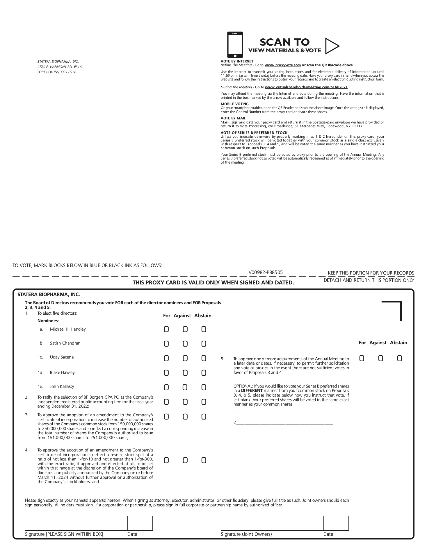 This Proxy Statement, the Notice of 2022 Annual Meeting of Stockholders and the Company’s 2021 Annual Report are available online at: http:/ir.staterabiopharma.com.