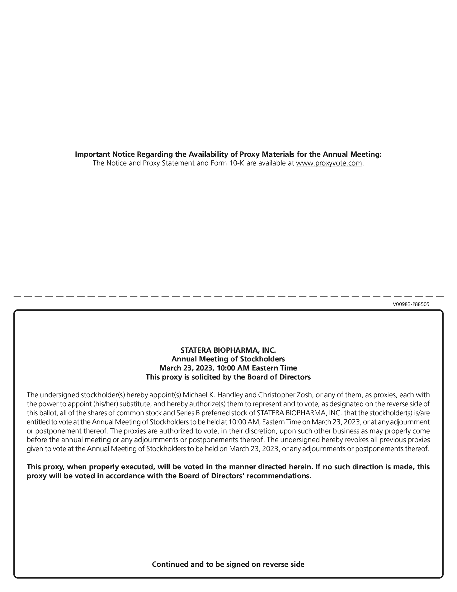 NOTICE IS HEREBY GIVEN that the 2022 Annual Meeting of Stockholders (the “Annual Meeting”) of Statera Biopharma, Inc. (the “Company”), a Delaware corporation, will be held telephonically, on Thursday, March 23, 2023, at 10:00 a.m., Eastern Time, in virtual format only via live audio webcast. You will be able to virtually attend the Annual Meeting online, vote and submit questions during the Annual Meeting by visiting www.virtualshareholdermeeting.com/STAB2023 during the meeting. Except as provided below with respect to the shares of our Series B Preferred Stock, $0.005 par value per share (the “Series B Preferred Stock”), only stockholders of record of our common stock, par value $0.005 per share (the “Common Stock”), on February 14, 2023 (the “Record Date”) will be entitled to vote at the Annual Meeting and any adjournments, continuations or postponements thereof that may take place. We are holding the Annual Meeting for the following purposes: