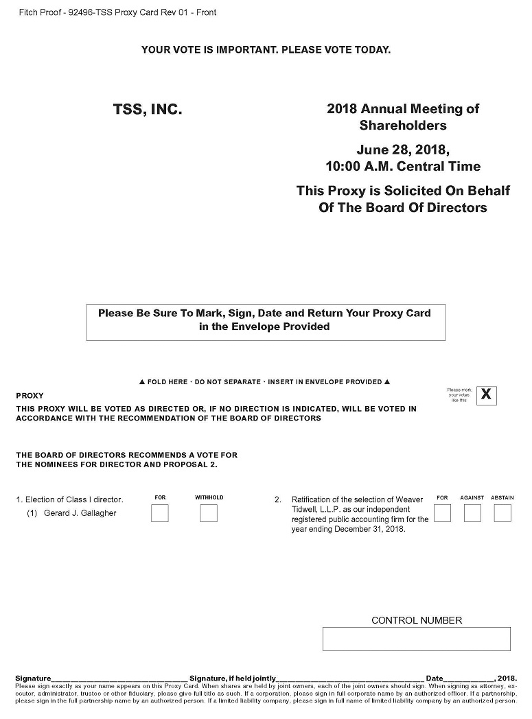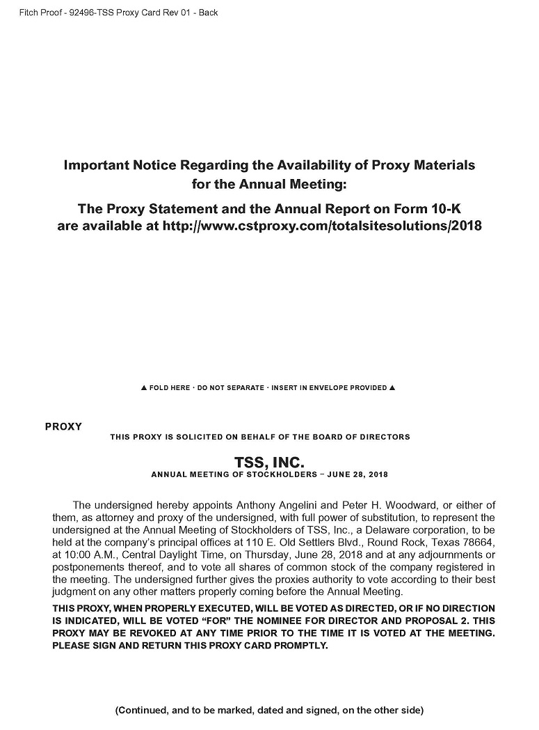 NOTICE IS HEREBY GIVEN that the 2018 annual meeting of stockholders of TSS, Inc. will be held at 10:00 a.m., Central Daylight Time, on June 28, 2017 (the “Annual Meeting”) at our offices located at 110 E. Old Settlers Blvd, Round Rock, Texas 78664 for the following purposes: