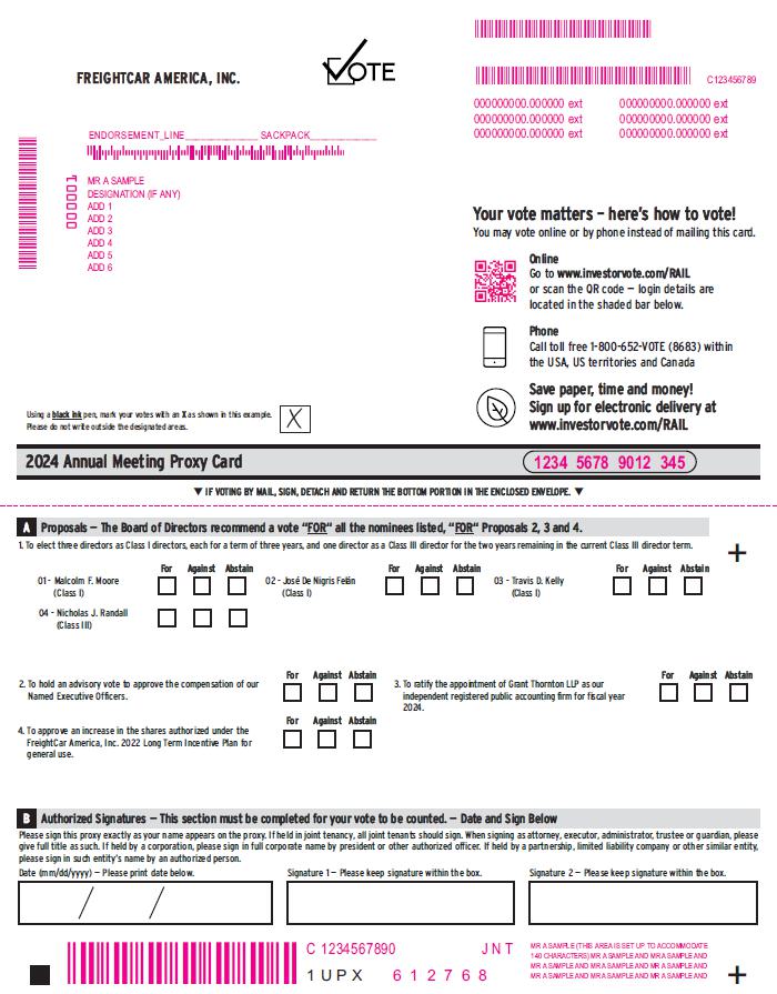 FREIGHTCAR AMERICA, INC. C123456789 ENDORSEMENT_LINE______________ SACKPACK 000000000.000000 ext 000000000.000000 ext 000000000.000000 ext 000000000.000000 ext 000000000.000000 ext 000000000.000000 ext 000001 MR A SAMPLE DESIGNATION (IF ANY) ADD 1 ADD 2 ADD 3 ADD 4 ADD 5 ADD 6 Your vote matters - here's how to vote! You may vote online or by phone instead of mailing this card. Online Go to www.investorvote.com/RAIL or scan the QR code - login details are located in the shaded bar below. Phone Call toll free 1-800-652-VOTE (8683) within the USA, US territories and Canada Save paper, time and money! Sign up for electronic delivery at www.investorvote.com/RAIL Using a black ink pen, mark your votes with an X as shown in this example. Please do not write outside the designated areas. 2024 Annual Meeting Proxy Card 1234 5678 9012 345 IF VOTING BY MAIL, SIGN, DETACH AND RETURN THE BOTTOM PORTION IN THE ENCLOSED ENVELOPE. 2. To hold an advisory vote to approve the compensation of our Named Executive Officers. For Against Abstain 3. To ratify the appointment of Grant Thornton LLP as our independent registered public accounting firm for fiscal year 2024. For Against Abstain A Proposals - The Board of Directors recommend a vote "FOR" all the nominees listed, "FOR" Proposals 2, 3 and 4. 1. To elect three directors as Class I directors, each for a term of three years, and one director as a Class III director for the two years remaining in the current Class III director term. 4. To approve an increase in the shares authorized under the FreightCar America, Inc. 2022 Long Term Incentive Plan for general use.01 - Malcolm F. Moore (Class I) For Against Abstain 02 - Jose De Nigris Felan (Class I) 03 - Travis D. Kelly (Class I) For Against Abstain For Against Abstain 04 - Nicholas J. Randall (Class III) B Authorized Signatures - This section must be completed for your vote to be counted. - Date and Sign Below Please sign this proxy exactly as your name appears on the proxy. If held in joint tenancy, all joint tenants should sign. When signing as attorney, executor, administrator, trustee or guardian, please give full title as such. If held by a corporation, please sign in full corporate name by president or other authorized officer. If held by a partnership, limited liability company or other similar entity, please sign in such entity's name by an authorized person. Date (mm/dd/yyyy) - Please print date below. Signature 1 - Please keep signature within the box. Signature 2 - Please keep signature within the box. C 1234567890 J N T 1 U P X 6 1 2 7 6 8 MR A SAMPLE (THIS AREA IS SET UP TO ACCOMMODATE 140 CHARACTERS) MR A SAMPLE AND MR A SAMPLE AND MR A SAMPLE AND MR A SAMPLE AND MR A SAMPLE AND MR A SAMPLE AND MR A SAMPLE AND MR A SAMPLE AND