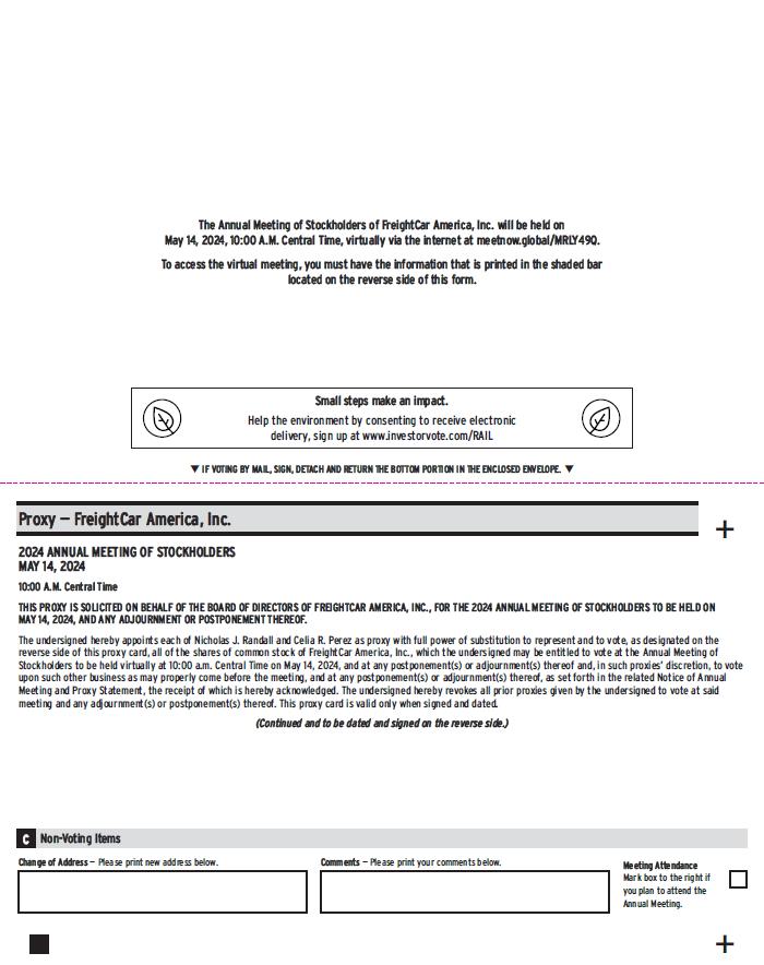 The Annual Meeting of Stockholders of FreightCar America, Inc. will be held on May 14, 2024, 10:00 A.M. Central Time, virtually via the internet at meetnow.global/MRLY49Q. To access the virtual meeting, you must have the information that is printed in the shaded bar located on the reverse side of this form. Small steps make an impact. Help the environment by consenting to receive electronic delivery, sign up at www.investorvote.com/RAIL IF VOTING BY MAIL, SIGN, DETACH AND RETURN THE BOTTOM PORTION IN THE ENCLOSED ENVELOPE. Proxy - FreightCar America, Inc. 2024 ANNUAL MEETING OF STOCKHOLDERS MAY 14, 2024 10:00 A.M. Central Time THIS PROXY IS SOLICITED ON BEHALF OF THE BOARD OF DIRECTORS OF FREIGHTCAR AMERICA, INC., FOR THE 2024 ANNUAL MEETING OF STOCKHOLDERS TO BE HELD ON MAY 14, 2024, AND ANY ADJOURNMENT OR POSTPONEMENT THEREOF. The undersigned hereby appoints each of Nicholas J. Randall and Celia R. Perez as proxy with full power of substitution to represent and to vote, as designated on the reverse side of this proxy card, all of the shares of common stock of FreightCar America, Inc., which the undersigned may be entitled to vote at the Annual Meeting of Stockholders to be held virtually at 10:00 a.m. Central Time on May 14, 2024, and at any postponement(s) or adjournment(s) thereof and, in such proxies' discretion, to vote upon such other business as may properly come before the meeting, and at any postponement(s) or adjournment(s) thereof, as set forth in the related Notice of Annual Meeting and Proxy Statement, the receipt of which is hereby acknowledged. The undersigned hereby revokes all prior proxies given by the undersigned to vote at said meeting and any adjournment(s) or postponement(s) thereof. This proxy card is valid only when signed and dated. (Continued and to be dated and signed on the reverse side.) C Non-Voting Items Change of Address - Please print new address below. Comments - Please print your comments below. Meeting Attendance Mark box to the right if you plan to attend the Annual Meeting.