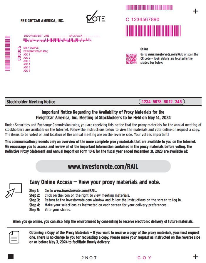 FREIGHTCAR AMERICA, INC. C 1234567890 ENDORSEMENT_LINE______________ SACKPACK_____________ 000001 MR A SAMPLE DESIGNATION (IF ANY) ADD 1 ADD 2 ADD 3 ADD 4 ADD 5 ADD 6 Online Go to www.investorvote.com/RAIL or scan the QR code - login details are located in the shaded bar below. Stockholder Meeting Notice 1234 5678 9012 345 Important Notice Regarding the Availability of Proxy Materials for the FreightCar America, Inc. Meeting of Stockholders to be Held on May 14, 2024 Under Securities and Exchange Commission rules, you are receiving this notice that the proxy materials for the annual meeting of stockholders are available on the Internet. Follow the instructions below to view the materials and vote online or request a copy. The items to be voted on and location of the annual meeting are on the reverse side. Your vote is important! This communication presents only an overview of the more complete proxy materials that are available to you on the Internet. We encourage you to access and review all of the important information contained in the proxy materials before voting. The Definitive Proxy Statement and Annual Report on Form 10-K for the fiscal year ended December 31, 2023 are available at: www.investorvote.com/RAIL Easy Online Access - View your proxy materials and vote. Step 1: Go to www.investorvote.com/RAIL. Step 2: Click on the icon on the right to view meeting materials. Step 3: Return to the investorvote.com window and follow the instructions on the screen to log in. Step 4: Make your selections as instructed on each screen for your delivery preferences. Step 5: Vote your shares. When you go online, you can also help the environment by consenting to receive electronic delivery of future materials. Obtaining a Copy of the Proxy Materials - If you want to receive a copy of the proxy materials, you must request one. There is no charge to you for requesting a copy. Please make your request as instructed on the reverse side on or before May 3, 2024 to facilitate timely delivery. 2 N O T C O Y